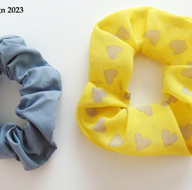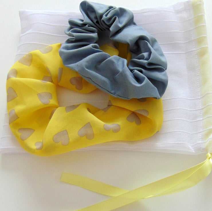 One is made from a grey cotton and the other from a sheer yellow nylon fabric with small grey hearts.