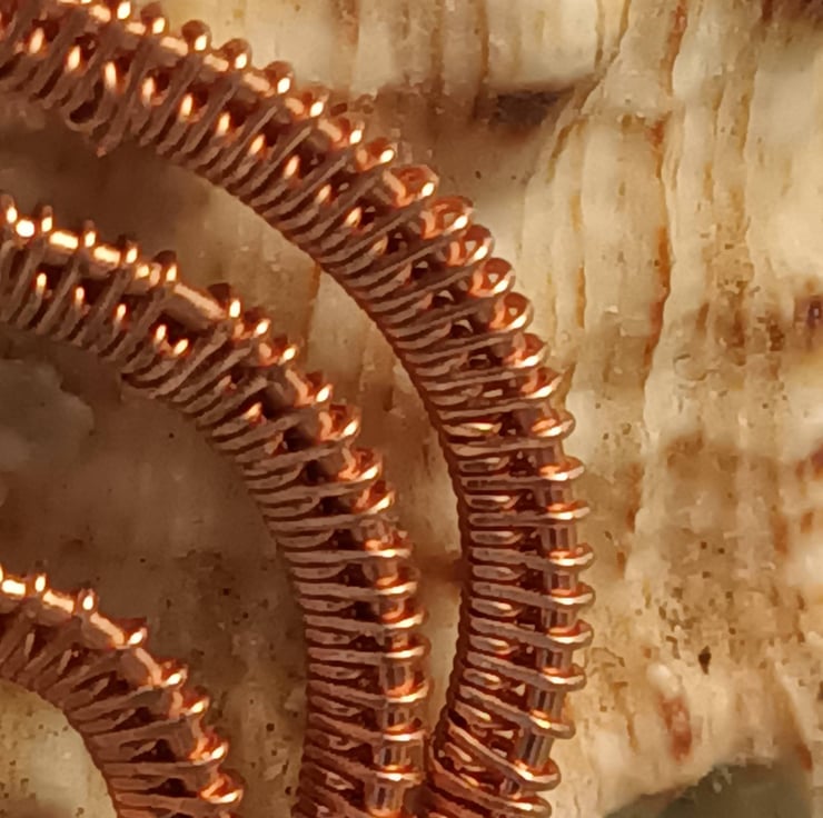 The copper wire weaving creates a distinct wirly curly design for evening or day wear.