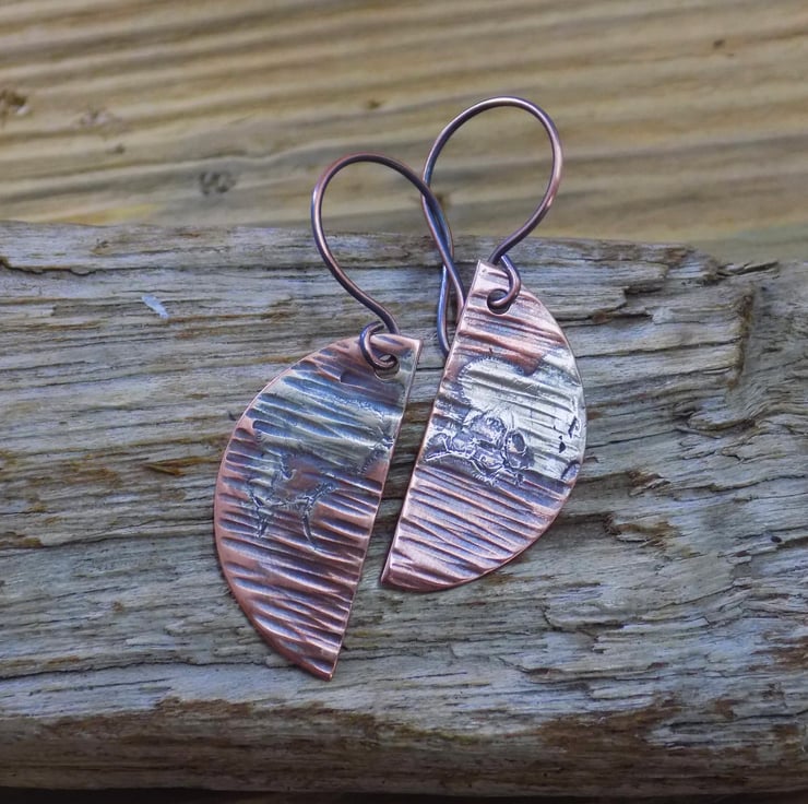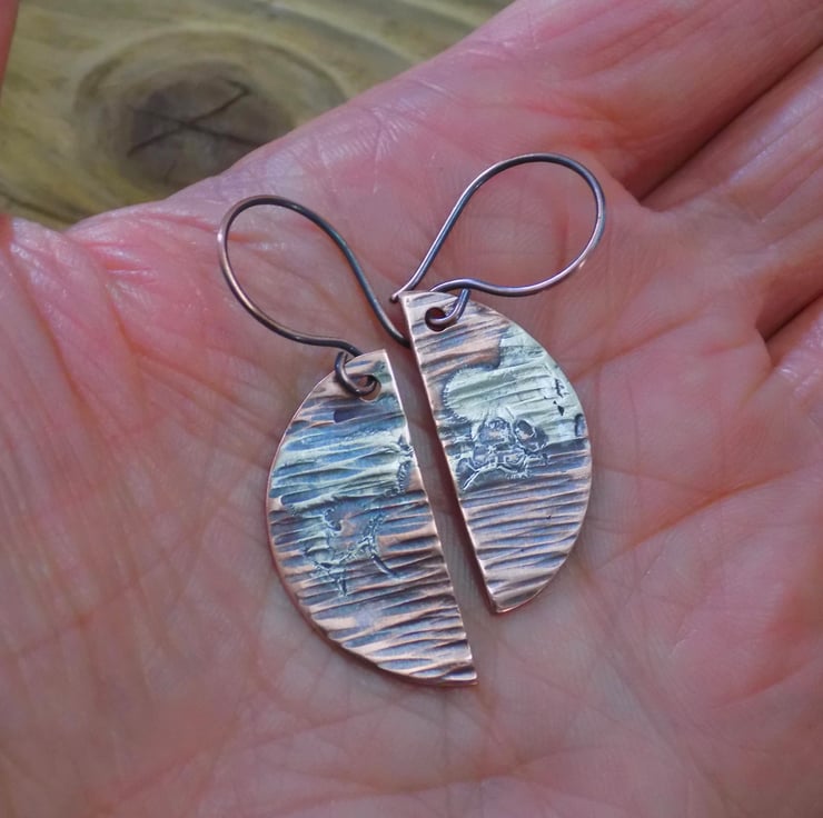 Made from copper sheet and a dash of melted silver. The earrings are simple half moons which have melted silver on the surface , then a ripple texture has been applied with a riveting hammer. Attached to aged copper French hooks made using 0.8mm wire.