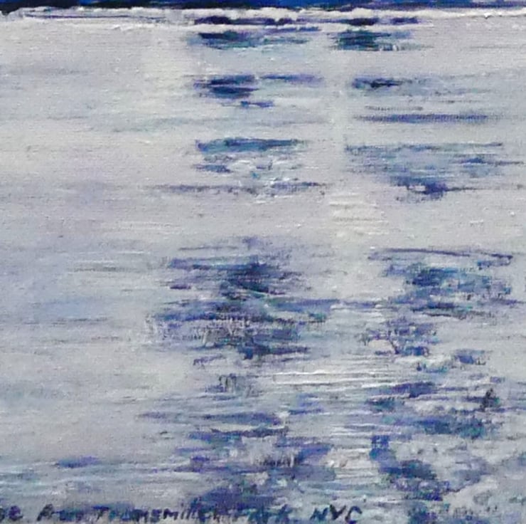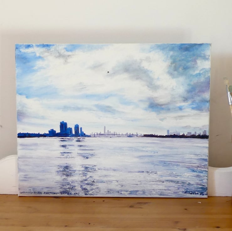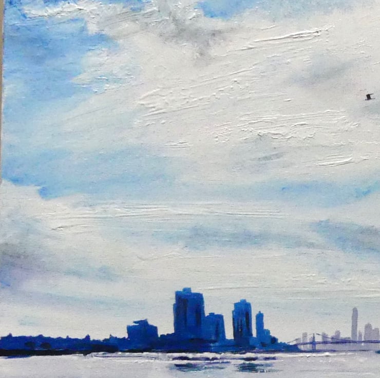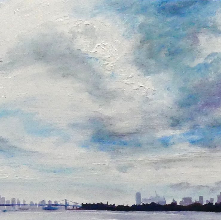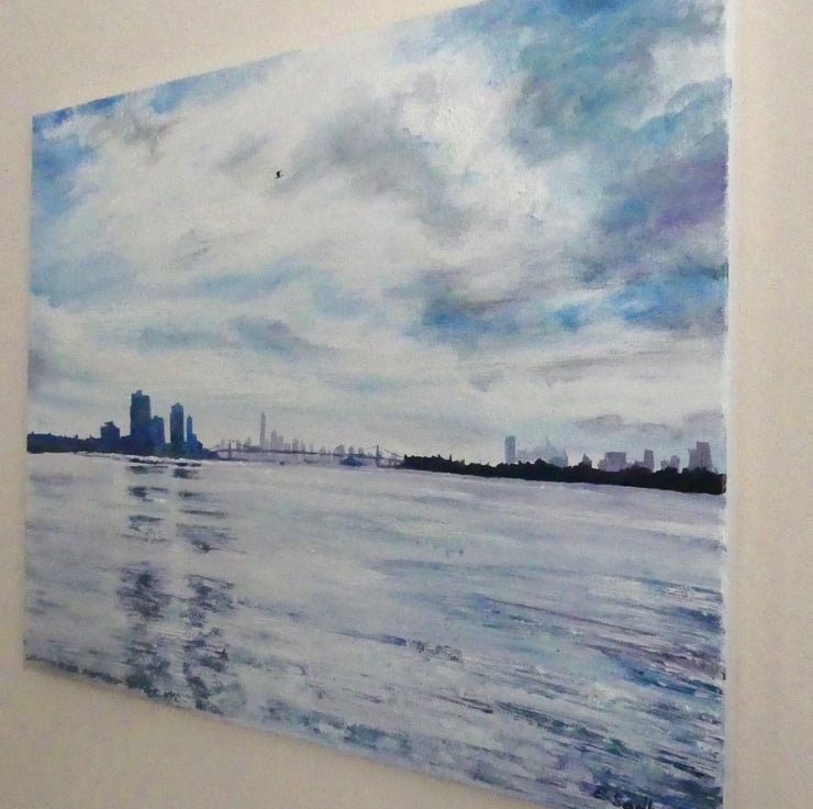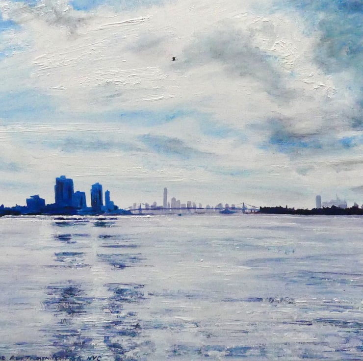 A New York cityscape oil painting of the Manhattan skyline. Looking downriver from Greenpoint the distant Williamburg bridge spans the cold East River. The light is waning this January afternoon as a lone gull flies away from gathering clouds.