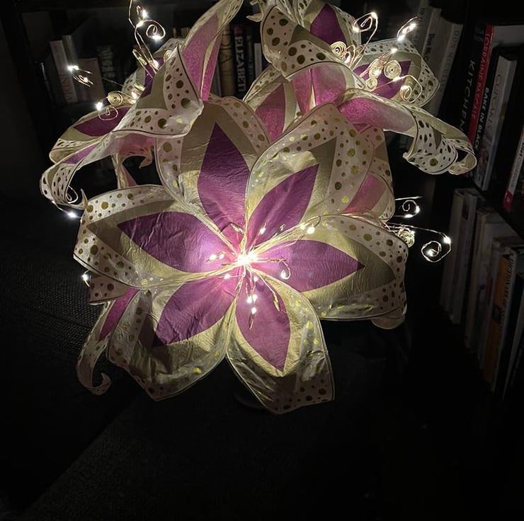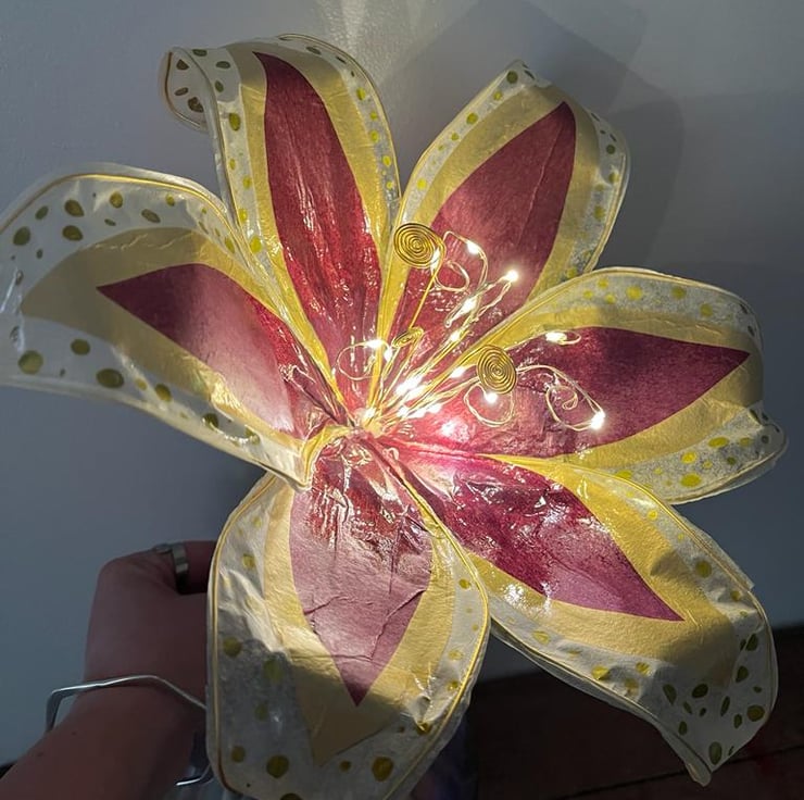 A beautiful handmade Paper and Wire Magicl Golden Flower with 20 LED battery operated lights.
