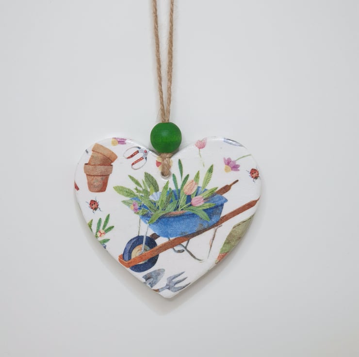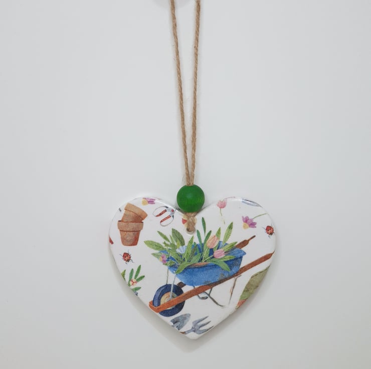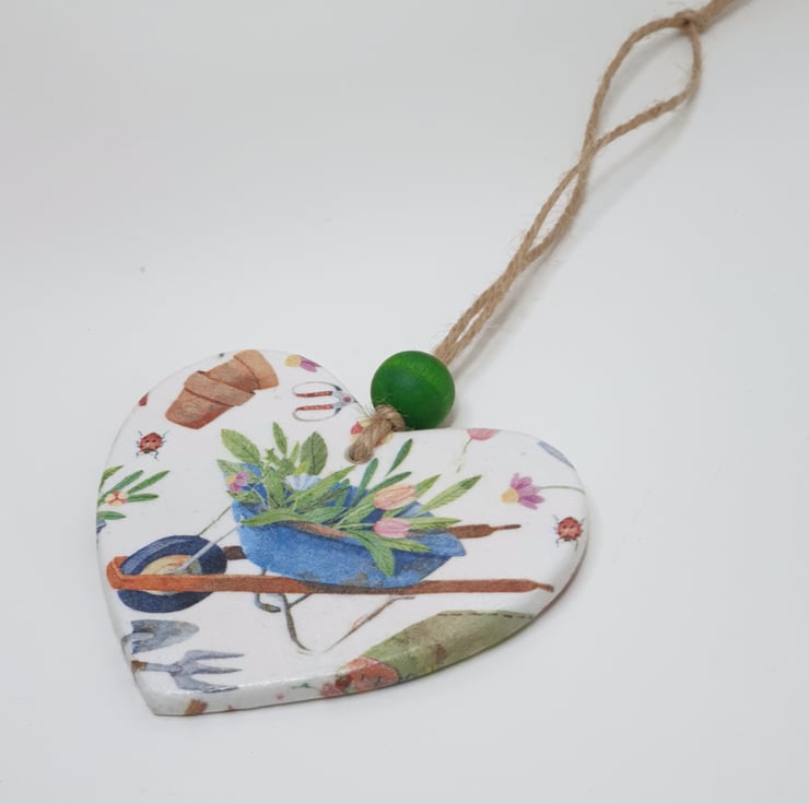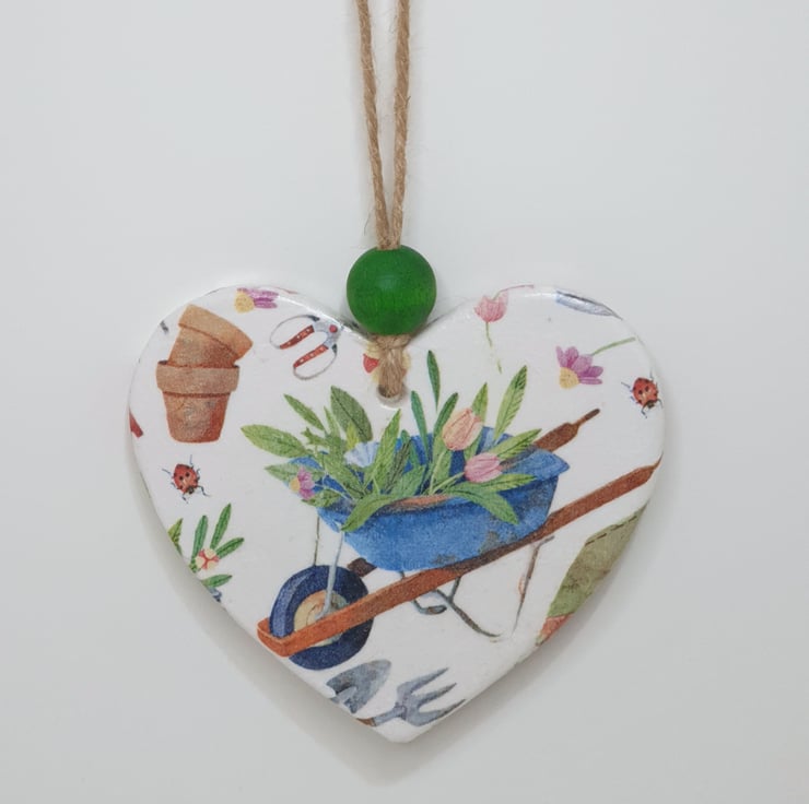 Clay hanging heart decoration which has been decoupaged with a wheelbarrow and tulips gardening design and would make a lovely gift for a gardener. The heart has been handmade from air dry clay and decoupaged with the gardening design on both sides and varnished. This lovely heart would look pretty hung in a window, from a piece of furniture or from a handle. The clay heart comes ready to hang from twine finished with a wooden green bead.