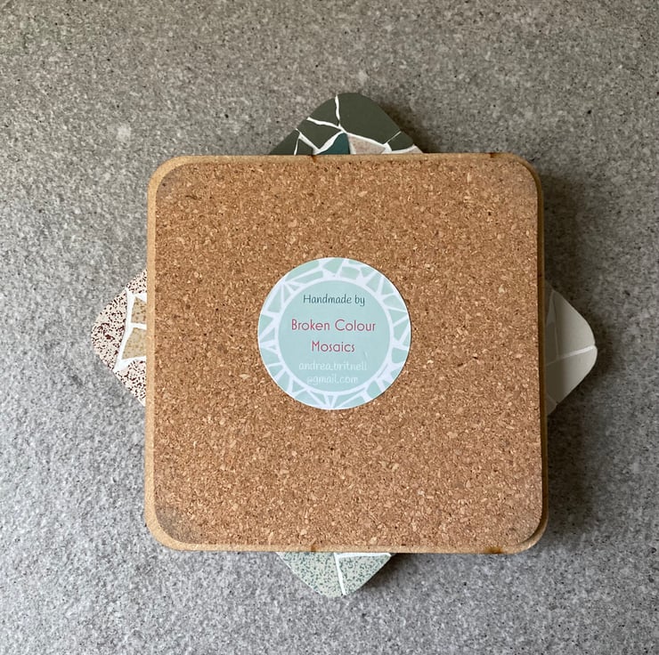 These Mosaic Coasters are built onto a wooden base and backed with cork. They are sealed and can be surface cleaned with a soapy cloth - you can even use a bit of diluted bleach for any stubborn tea stains. But due to the wooden base, the coaster must not be submerged in water as the base will swell and may dislodge the tiles.