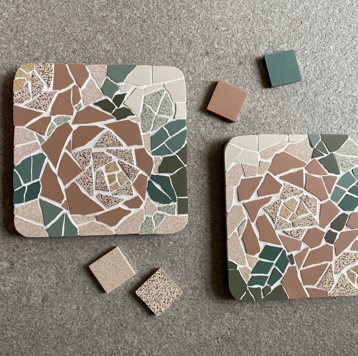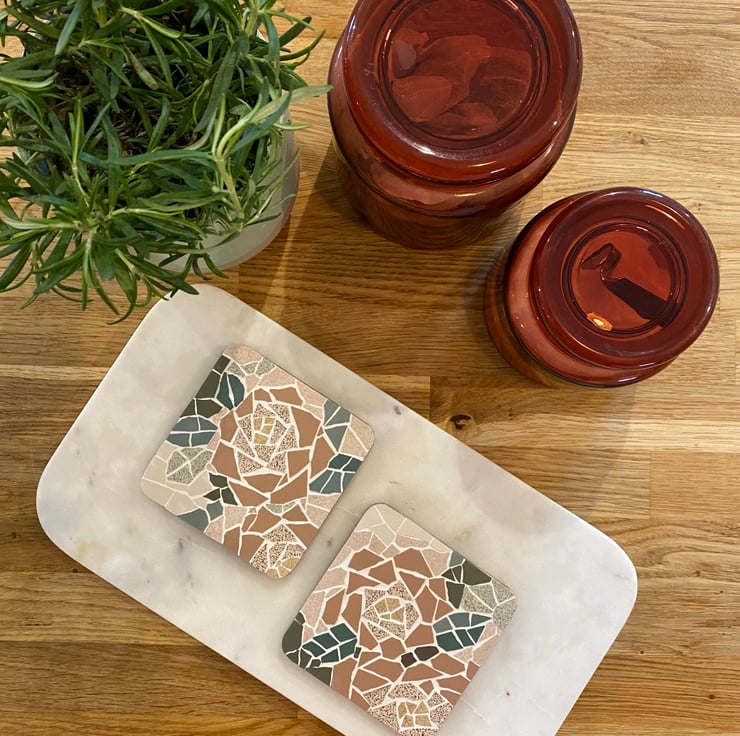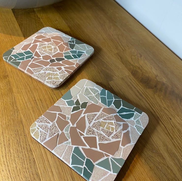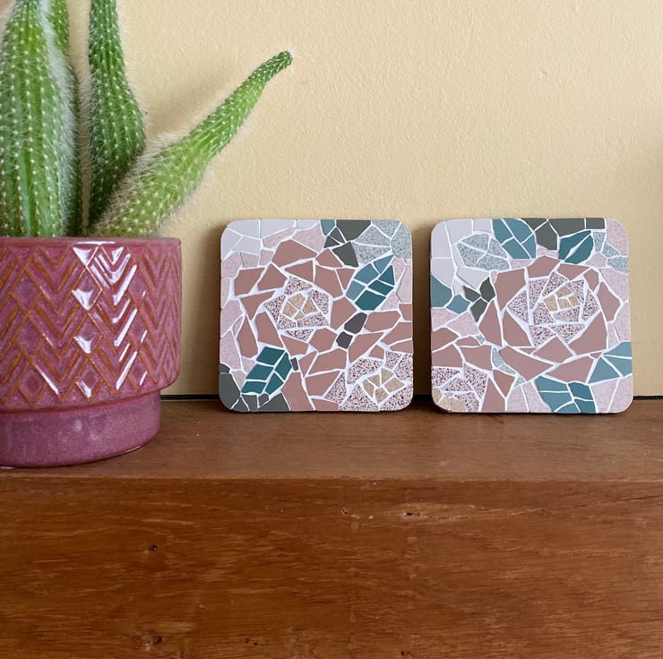 Two elegant, unique mosaic coasters that feature abstract roses in the dusky pink and brick red speckle palette. The soft pink petals are complimented by a mix of green leaves on a white background.