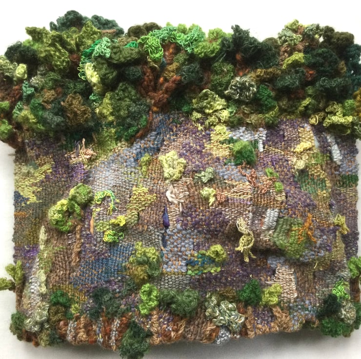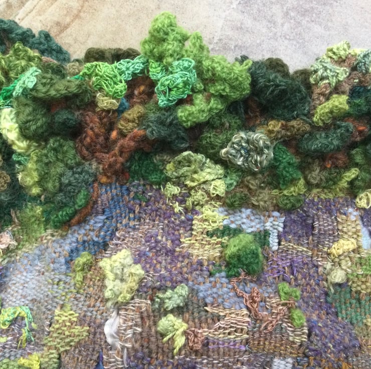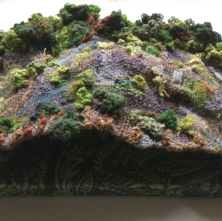 Mount Lico, is a one of a kind, mounted 3D tapestry weaving with added embroidery and crochet elements. It has been hand woven with a mixture of wool, linen, cotton, and rayon yarns in various shades of brown, green, blue, grey and purple. It is woven in 3 pieces and joined together, the embroidery and crochet foliage added afterwards and the slits in the weaving are backed with different cotton and silk fabrics. It is stitched onto chicken wire and bent into a curved shape and fixed onto a fabric covered frame which measures 30 x 29 x 11cm and hangs from d rings with twine.
