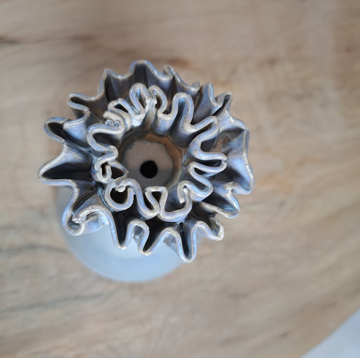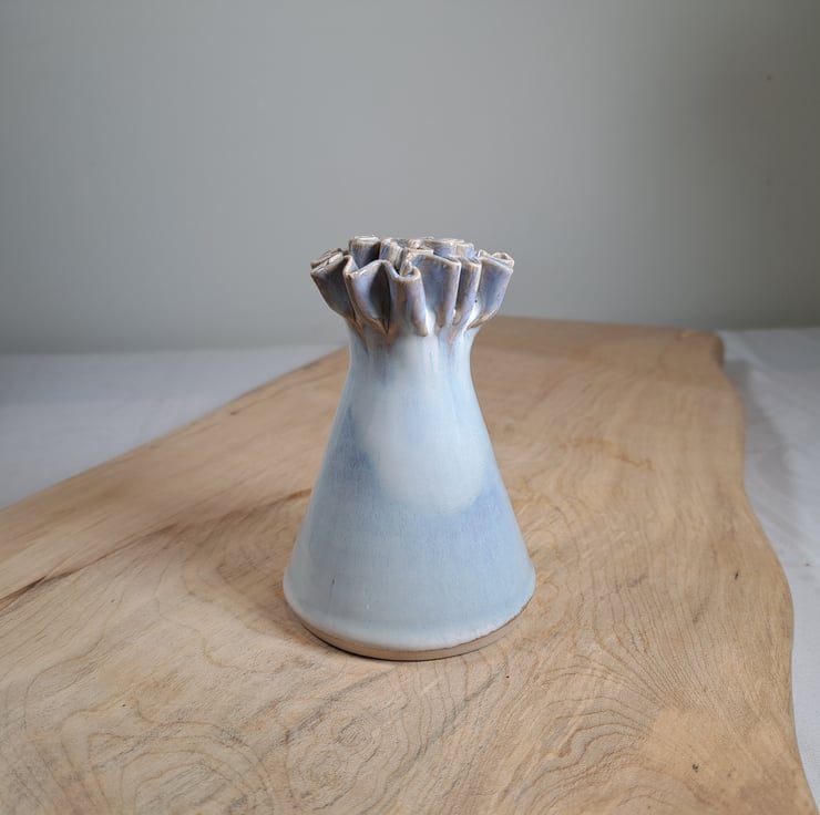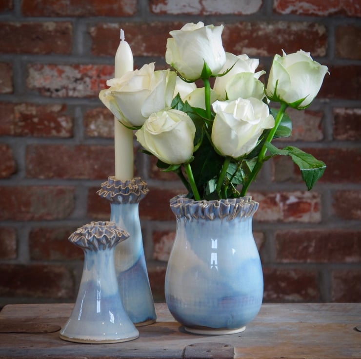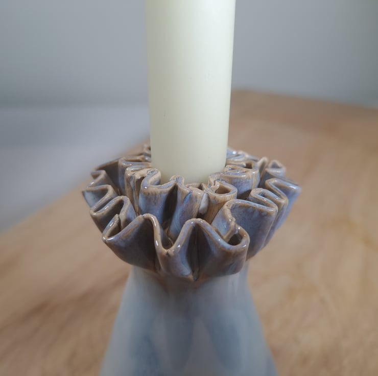 A hand made off white candle stick, hand thrown on the wheel with a frill added by hand.