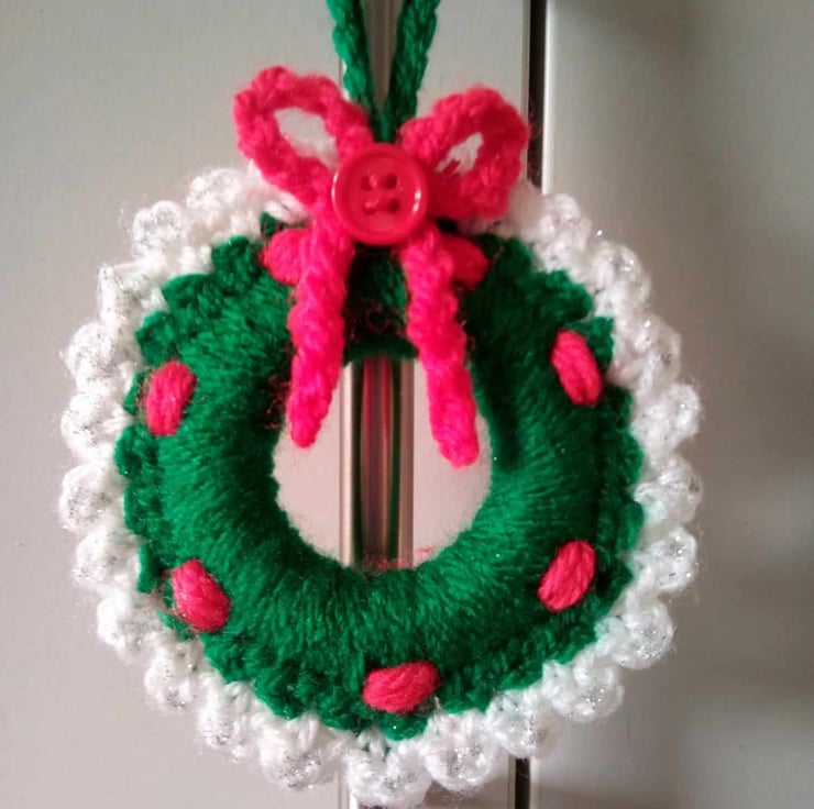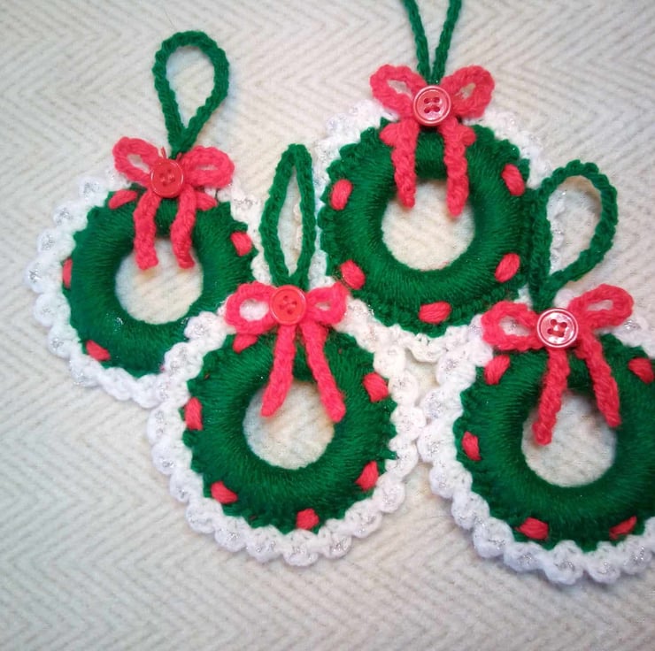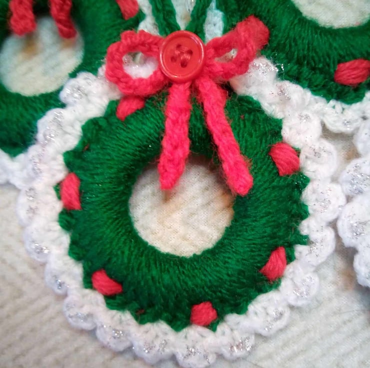 crochet xmas tree decorations pack of four tree wreaths in green woth red bow berries and button detail edged in white with a little glitter which sparkles in the light pics dont do them justice