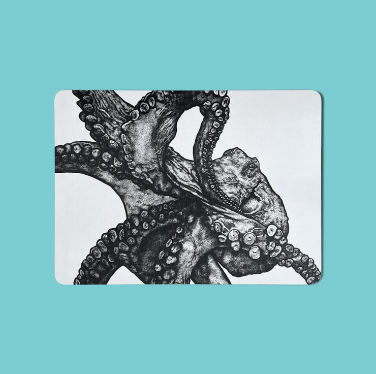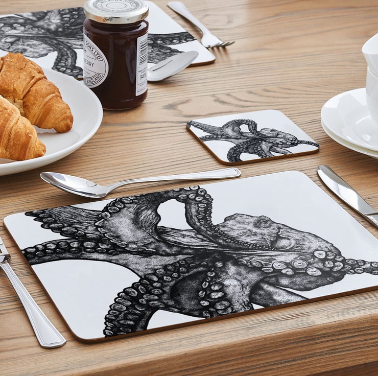 This elaborate illustrated octopus is swimming across this table mat placemat. Melamine and cork materials, made in the UK.