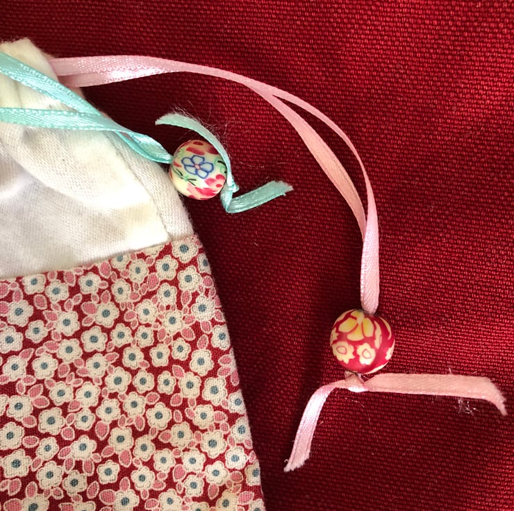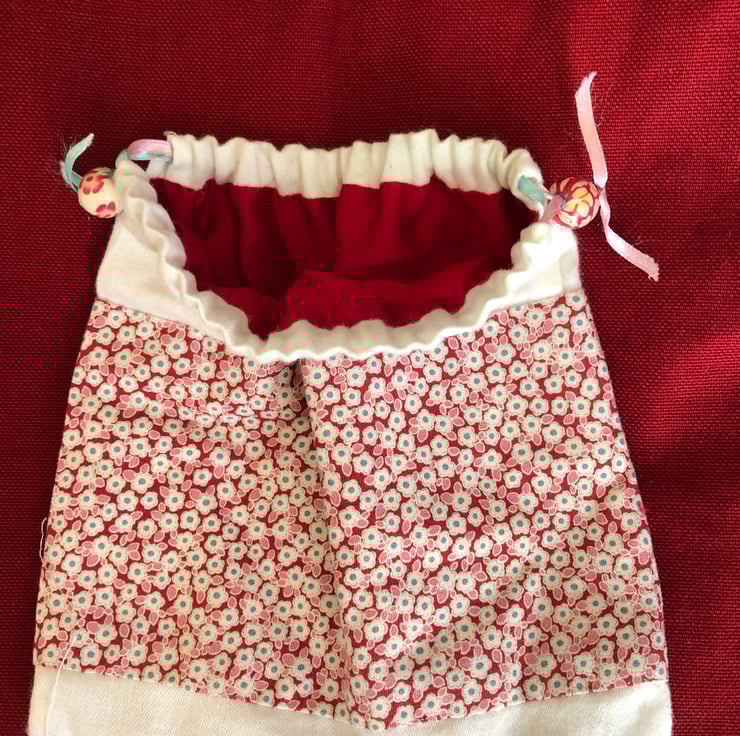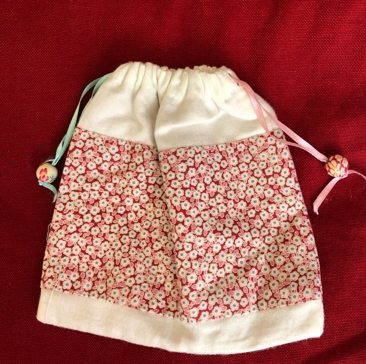Floral gift bag/keepsake bag. Pin k and cream cotton with red silk lining, ribbons and beads. 80p from the sale of this item will be donated to Save the Children.