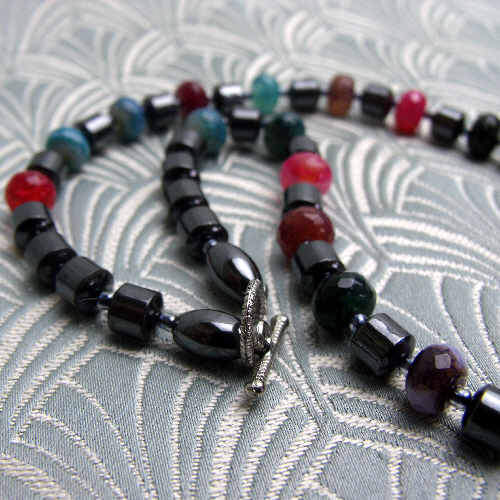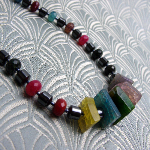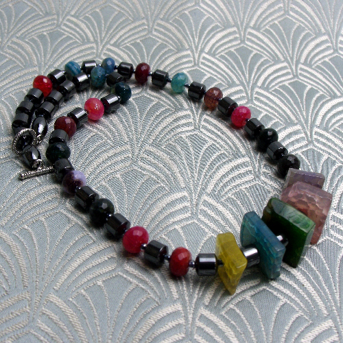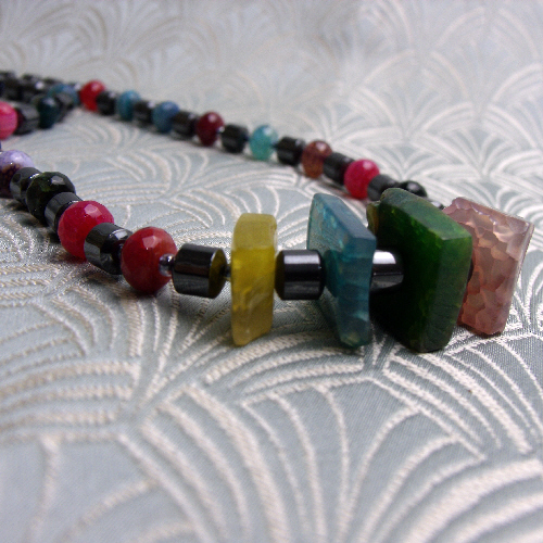 This short chunky agate gemstone necklace continues with more hematite beads and I have alternated these hematite semi-precious stone beads with discs of brightly coloured agate.