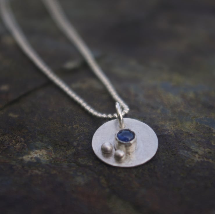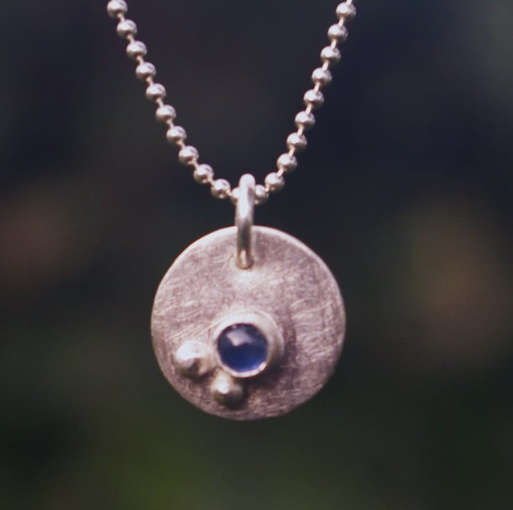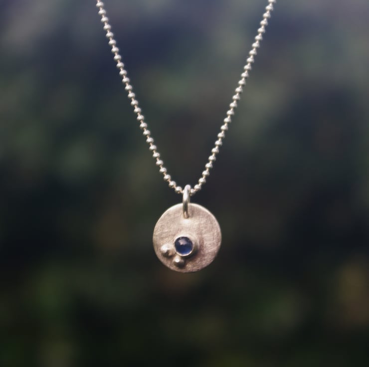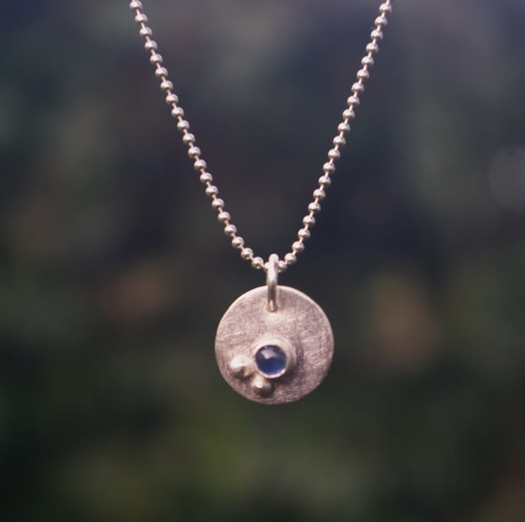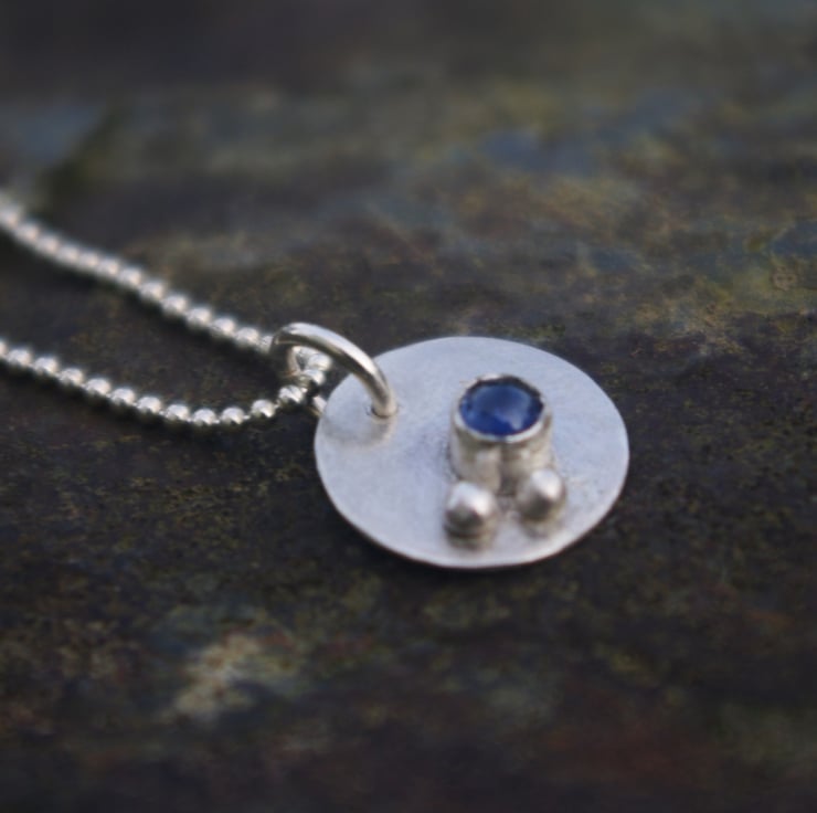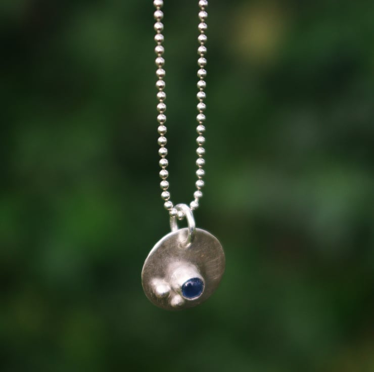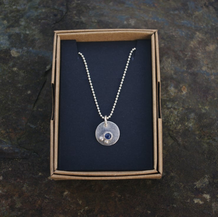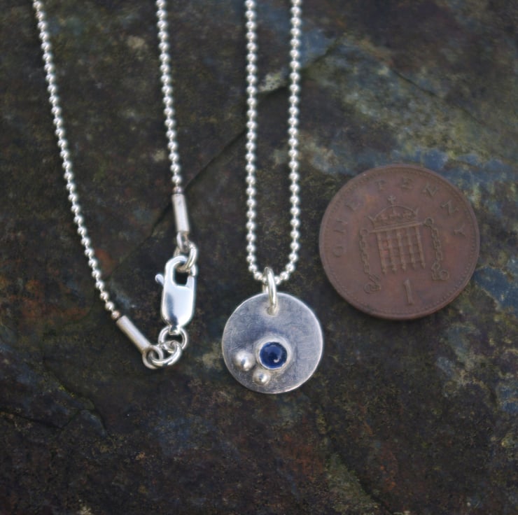 A simple but elegant necklace with a small deep blue sapphire cabochon handset in silver on a sterling silver disc. I have complemented this with with 2 silver balls of silver next to the sapphire and these are perfectly picked up with the sterling silver ball chain. The chain is 43cm /17 inches long including the clasp.