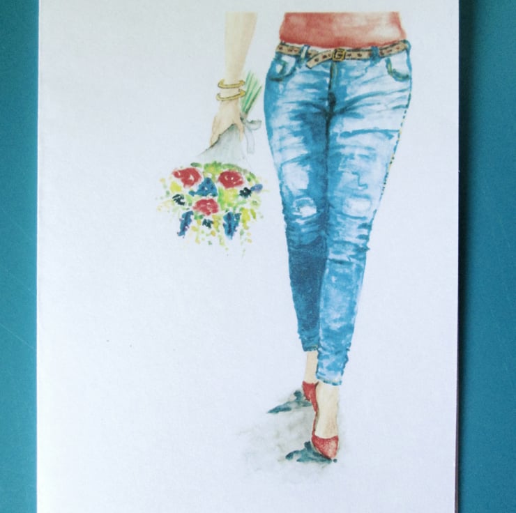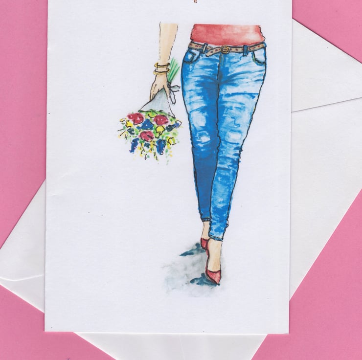 Greetings card, blank inside for your own message. A printed card of a pleasant painting of a girl in Jeans and red shoes with a bouquet of flowers.