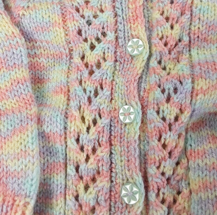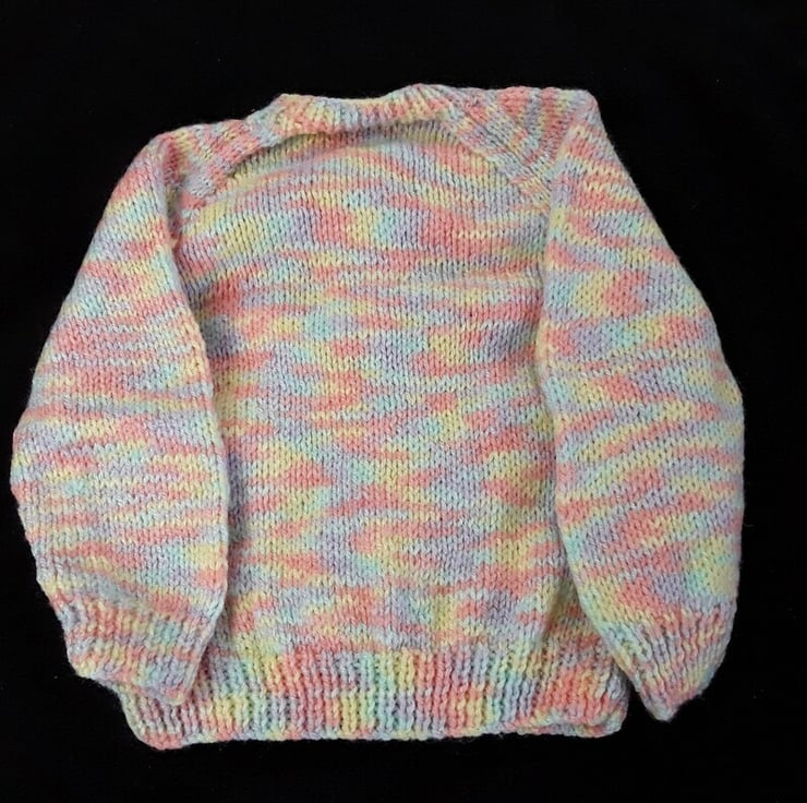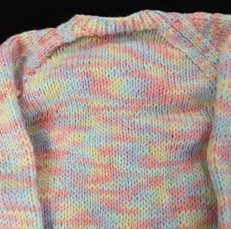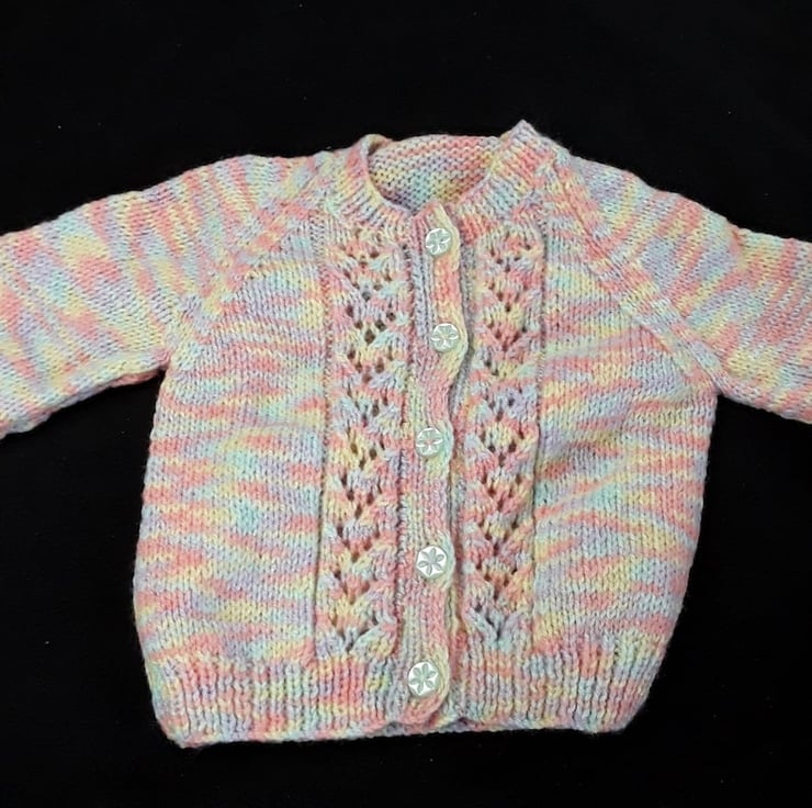 Hand-Knitted Pastel Multicolored Baby Girl Cardigan, a charming addition to your little one's wardrobe. Meticulously crafted with a delightful Nursery-colored multicolored yarn, this cardigan predominantly features soothing peach tones complemented by playful splashes of green, blue, and yellow. As the yarn is skillfully knitted, it creates enchanting pastel patches of color, resulting in a captivating and one-of-a-kind appearance.This stocking stitch cardigan showcases a round neckline and secures elegantly with pale green buttons. Adding to its appeal, delicate eyelet patterns grace both sides of the buttons, forming rows of dainty V shapes.Tailored to fit a 20-inch (51 cm) chest, this cardigan is designed for babies aged 6 to 12 months. When laid flat, its dimensions are as follows:Across Chest: 10.5 inches (26.5 cm)Underarm Sleeve Seam: 6.5 inches (16.5 cm)Full Length (Shoulder to Hem): 11.5 inches (29.25 cm)Crafted from 100% acrylic, this cardigan offers a harmonious blend of softness and durability. Furthermore, it can be conveniently machine washed on a gentle 30°C cycle, ensuring effortless care and upkeep.Enrobe your little one in the delightful pastel shades of our Hand-Knitted Pastel Multicolored Baby Girl Cardigan, a perfect fusion of style and comfort.