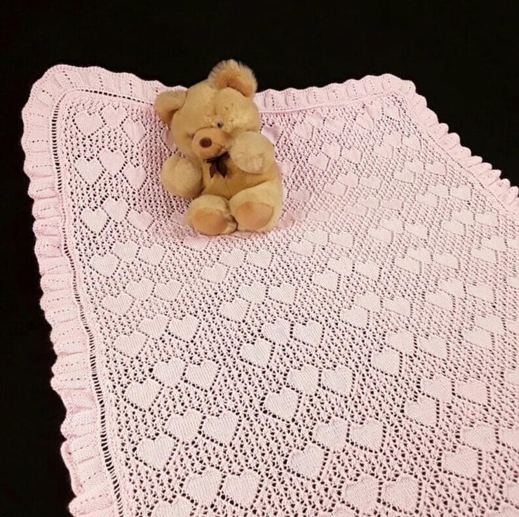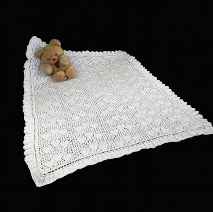 Hand-Knitted Lacy Baby Christening Shawl—a symbol of affection and tenderness, meticulously designed to cocoon your precious newborn in a blend of comfort and sophistication. This exquisite shawl is the result of countless hours of devoted hand-knitting, making it a truly exceptional piece.Crafted from a lightweight yarn, this shawl drapes gracefully and is ideal as a receiving blanket for your baby, regardless of their gender. It's also a cherished choice as a christening shawl. The standout feature of this shawl is its intricate lacy design, adorned with delicate heart motifs that infuse an air of love and sweetness.The hearts have been thoughtfully arranged in groups of threes, with the center heart slightly elevated, forming an enchanting pattern. The shawl boasts a total of 5 sets of hearts, each with 12 heart sets running along its length. An elegantly hand-knitted border adds a subtle ruffle effect, further enhancing its beauty.Measuring approximately 39 X 45 inches (99 cm X 114 cm), this shawl provides ample coverage for your little one. Crafted from 100% Acrylic, it offers a soft and gentle touch against your baby's delicate skin. What's more, it's machine washable on a gentle 30° cycle, ensuring effortless care and maintenance.This hand-knitted lacy baby shawl is more than a mere blanket; it's a family heirloom in the making. With proper care, it will withstand the test of time, becoming a cherished legacy passed down through generations. Embrace the tradition