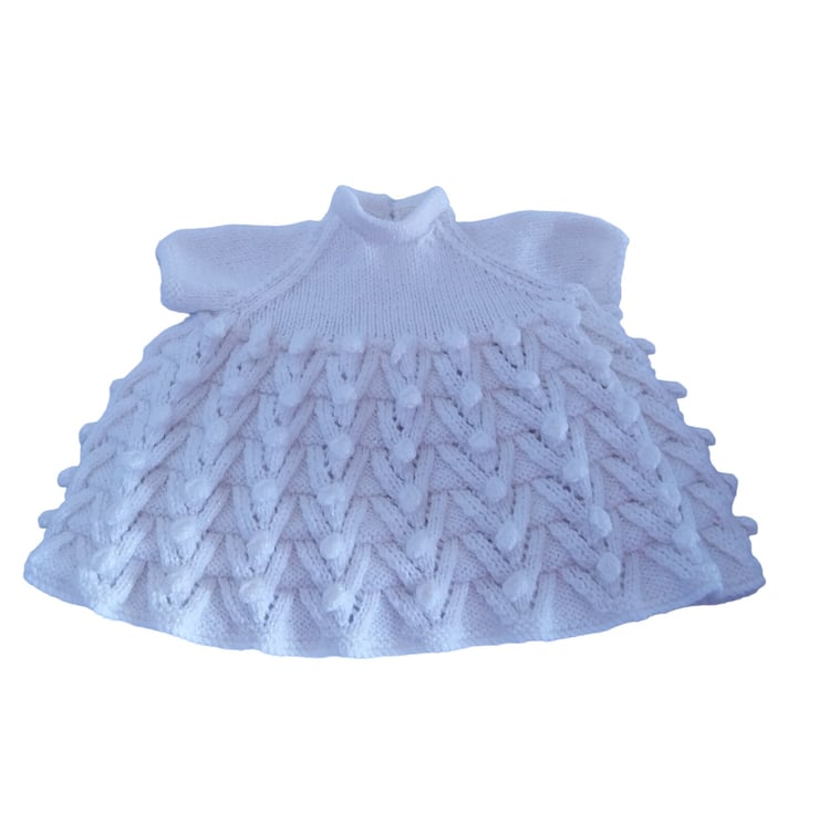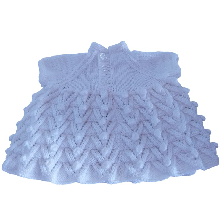 This captivating duo is lovingly handcrafted with soft and sparkly yarn, adding a touch of enchantment to your baby's wardrobe. The dress features a charming bobble pattern on the skirt, while the bodice and sleeves display the classic stocking stitch, offering both style and comfort. Adorned with short sleeves and a round neckline, securely fastened with buttons down the back, this dress is a delightful choice for any occasion.