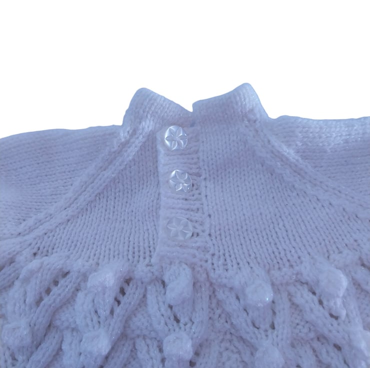 Hand-Knitted Baby Sparkly Lilac Cardigan and Sparkly White Dress set, thoughtfully designed for ages 0-3 months.