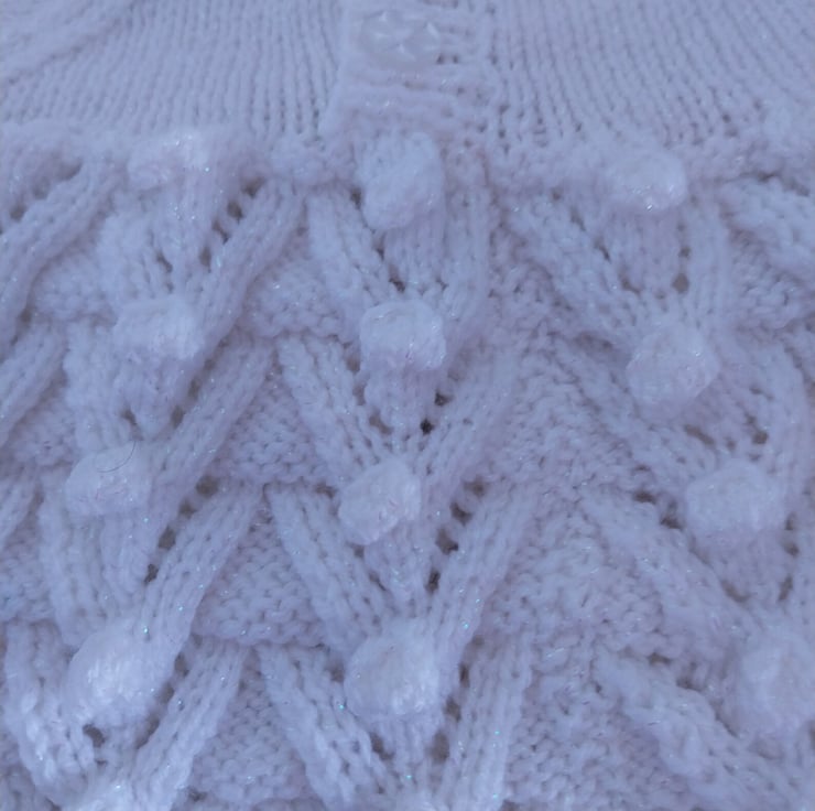 The matching cardigan is knitted with a splendid lilac sparkly yarn, mirroring the bobble pattern featured on the dress. With long sleeves and a round neckline, this cardigan seamlessly combines fashion and coziness. The front button fastening adds an endearing touch to this charming ensemble.