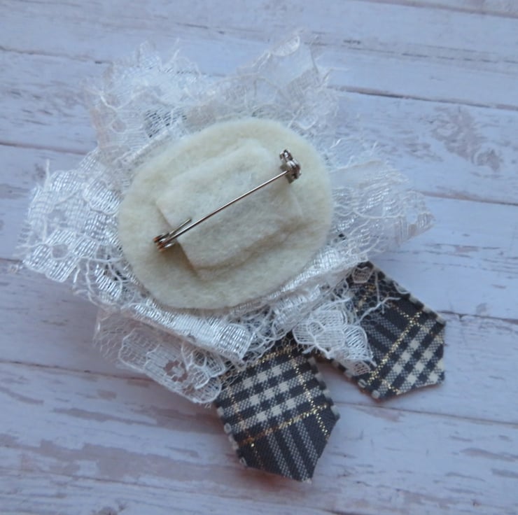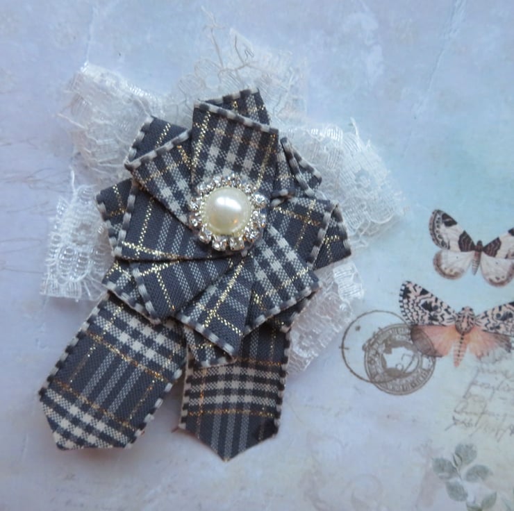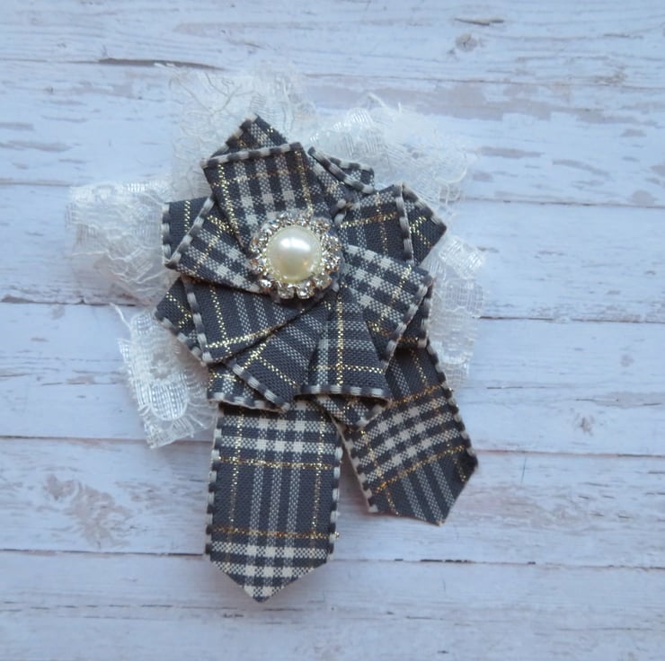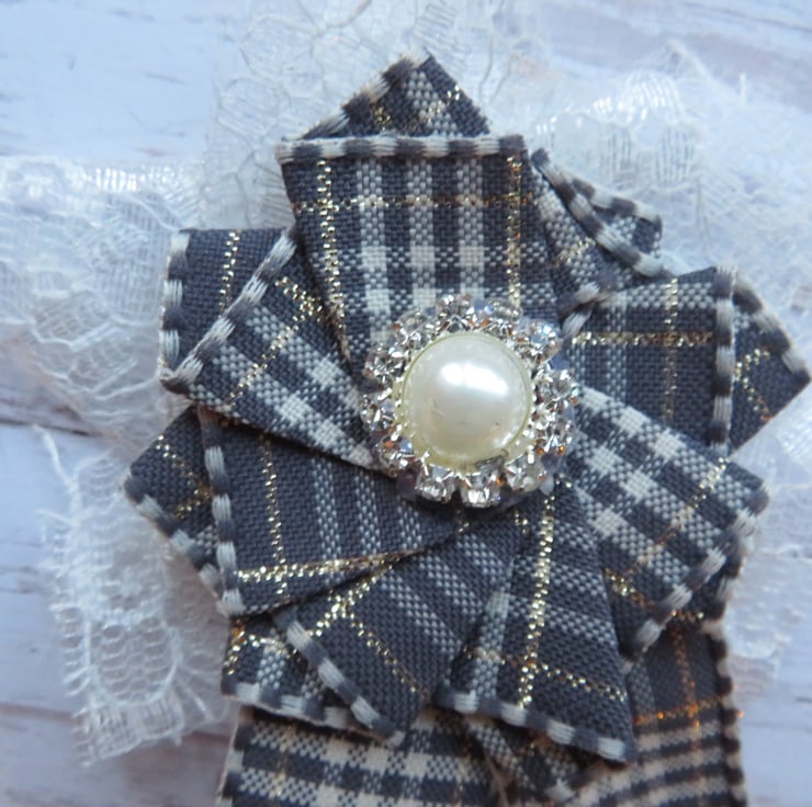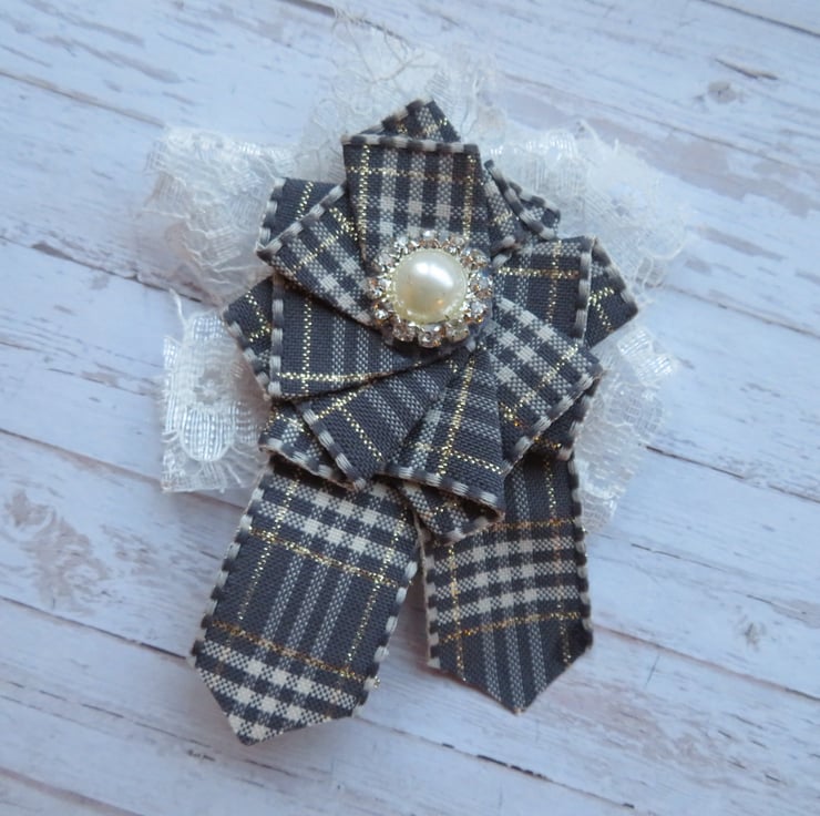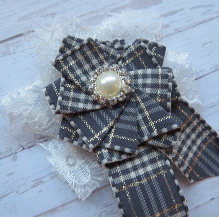 Created with an ivory lace fabric in a ruffle and a Wardle fancy tartan thick plaid ribbon which is grey and ivory with a metallic gold thread running through it with a short shaped trail, finished with finished with a small round pearl & diamante stud (there is slight discolouration on the metal by one of the diamante)