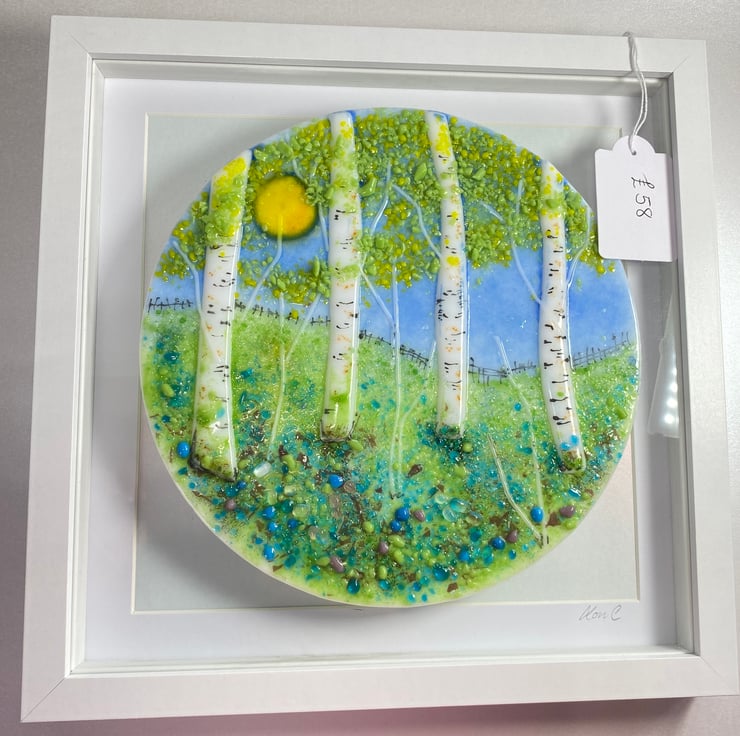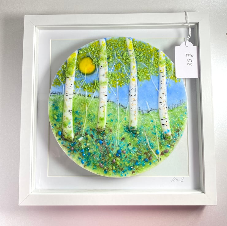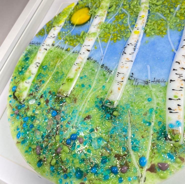 Gorgeous fused glass design of silver birch trees on a round disk of glass . The art work is created so as to retain contours . Fused glass has a tremendous vibrancy to it . The circular shape gives added interest to this one of a kind piece . Perfect to add light and vibrant interest to your walls . The picture measures approximately 26 cm square .