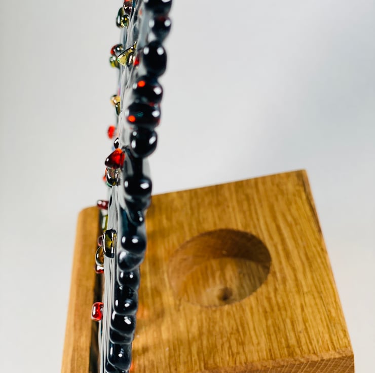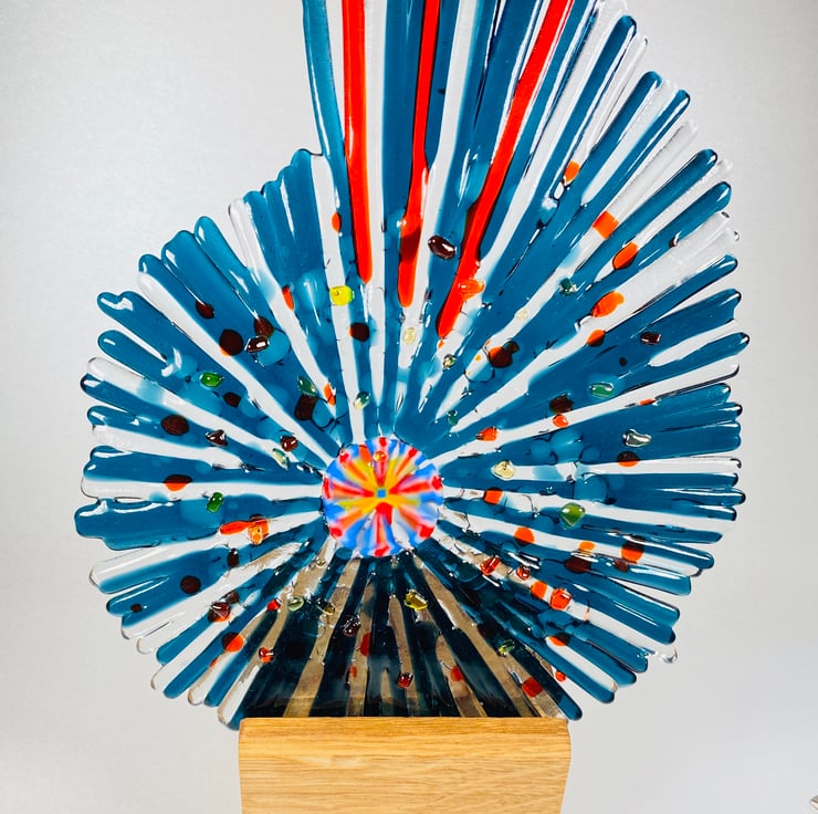Unique one of a kind dark teal and orange fused glass ammonite in oak base . This ammonite glass art is created from many thinly cut glass pieces positioned and fused in my kiln to create a wonderful textured finish . Not only is it stunning bu day , you can add night time interest by backlighting with a t light as there is a recess in the oak base . Approximately 8inch wide x12 inch high . The glass slots into the groove within the base but is easily removed for ease of cleaning and transporting .