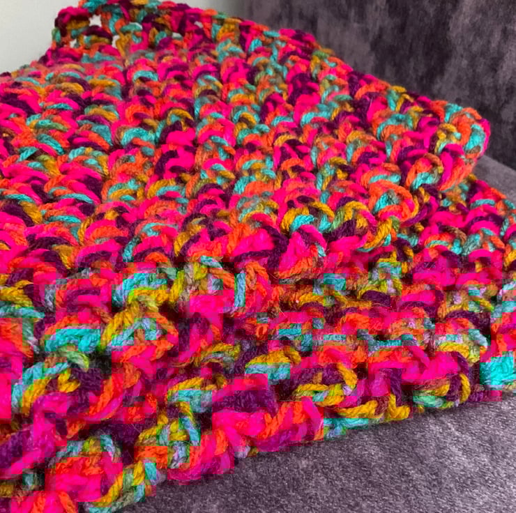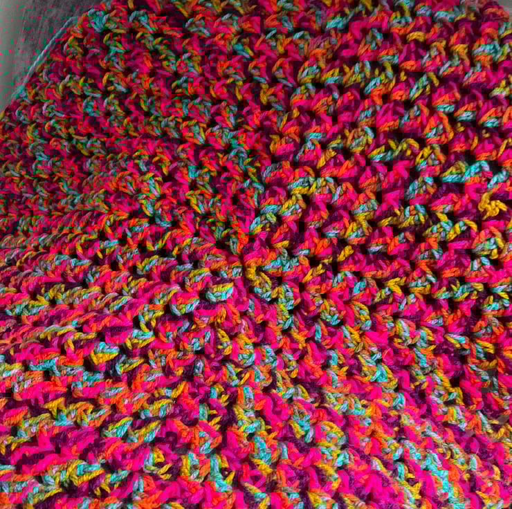 Small Crochet Blanket, handmade in a bright cerise mix of self patterning acrylic yarn.