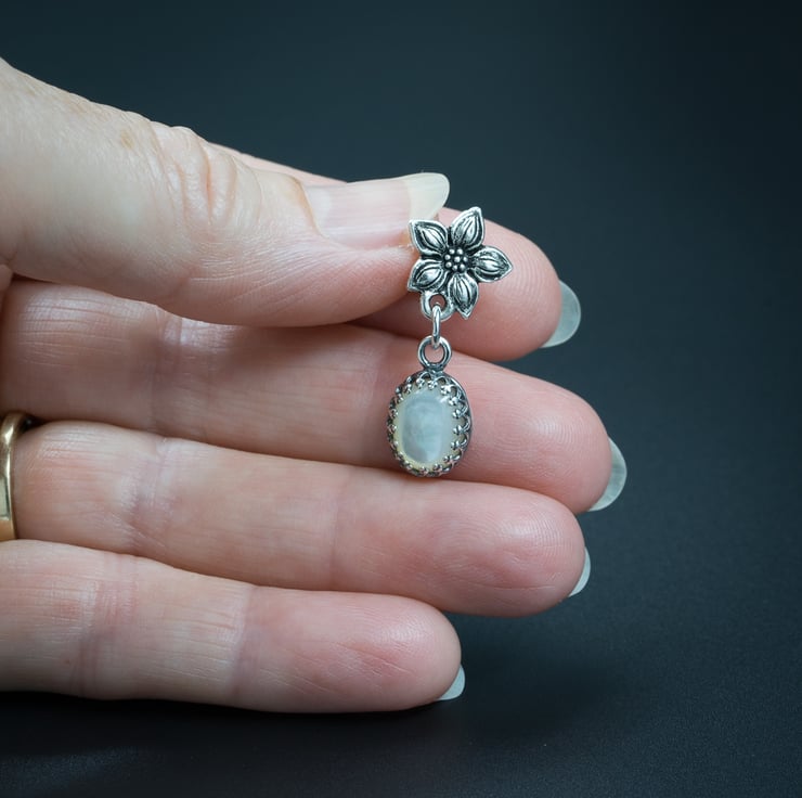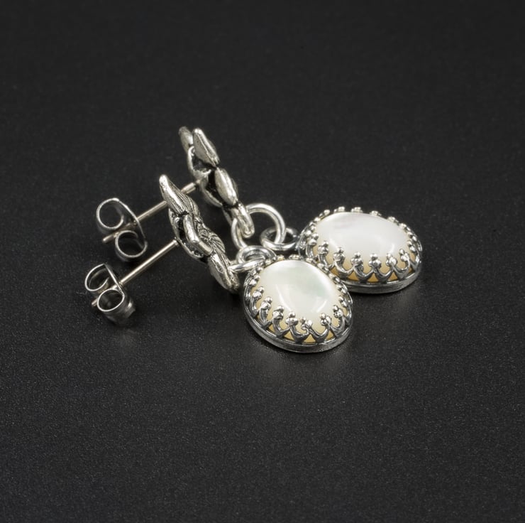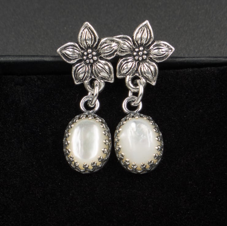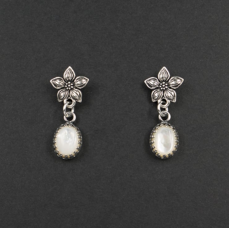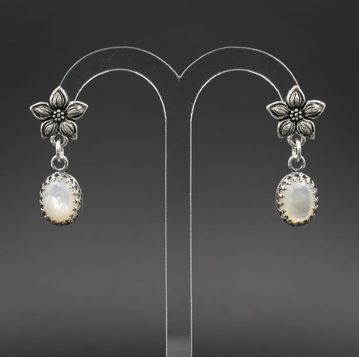 Lovely shimmering 10X8mm cream mother of pearl stones are set in an open back antique silver plated setting and hang below a beautifully detailed flower stud earring. The ear posts are titanium with a butterfly clip to secure.