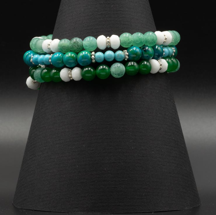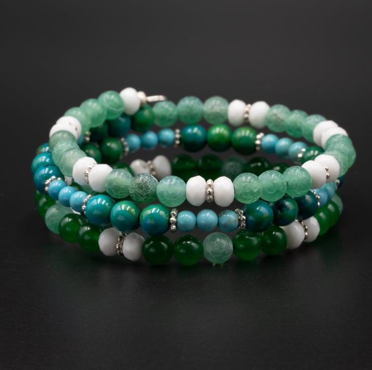A triple coil memory wire bracelet using 6mm rounds of green agate and chrysocolla together with 4mm rounds of turquoise and 6mm rondelles of white agate are accented with silver plated daisy spacers for a lovely fresh spring mix of colours.