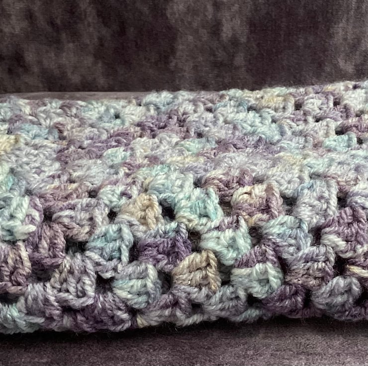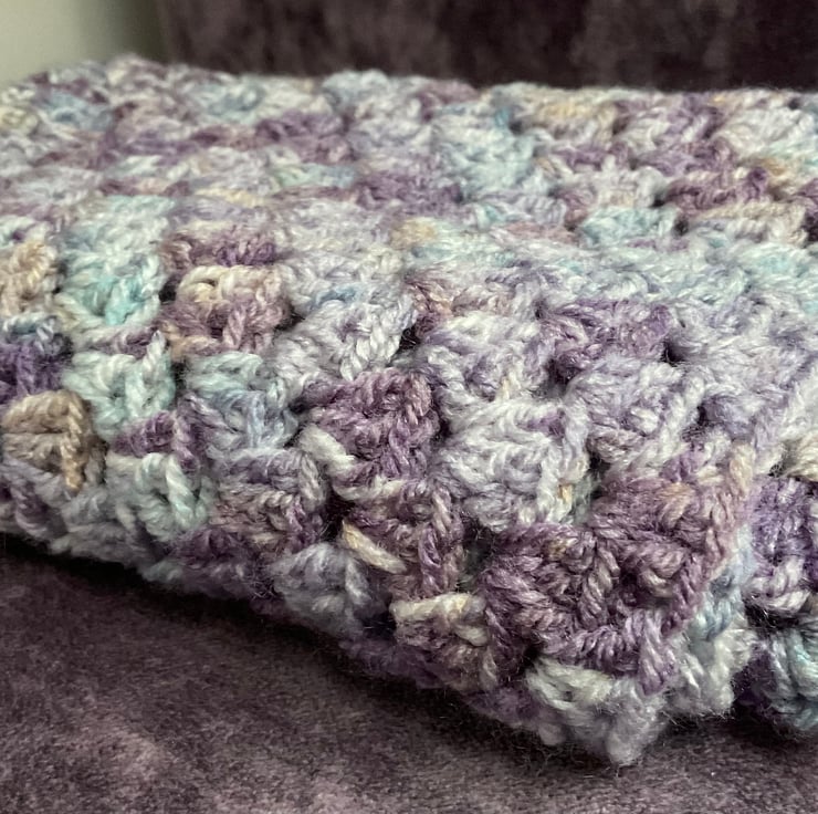 Pretty purple and lilac acrylic yarn creates a beautiful muted look for this Crochet Blanket.
