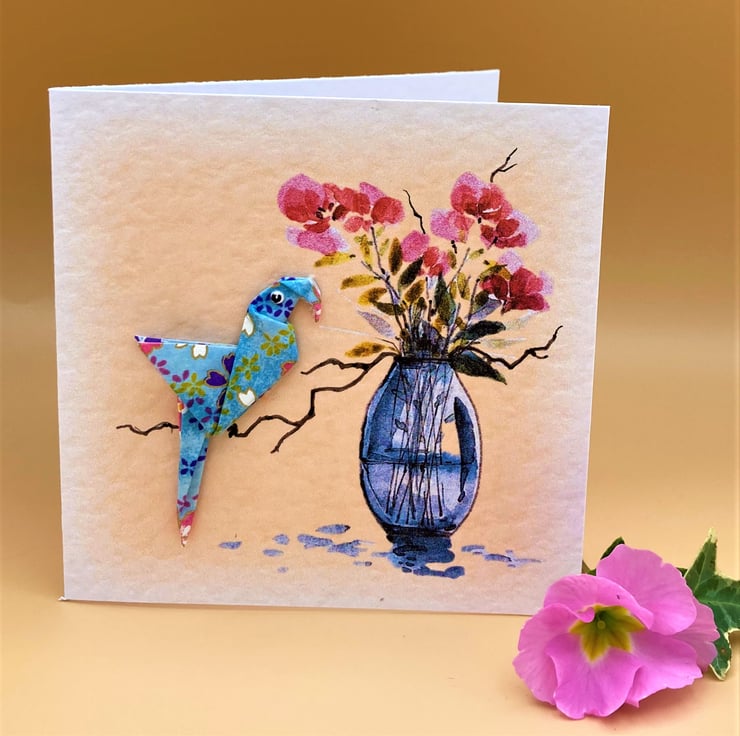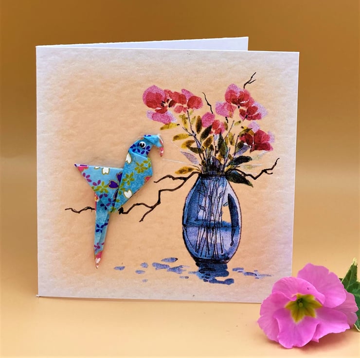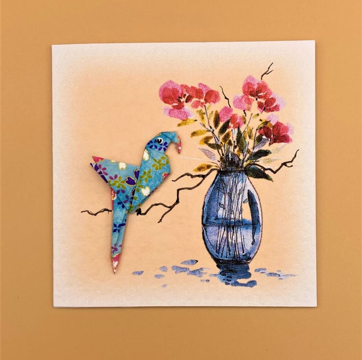 This unique Greetings Card shows a hand folded sky blue Origami Parrot firmly attached to a pretty floral card. The background print design is taken from one of my original watercolour paintings and enhanced with hand drawn detail. I make the origami parrots from carefully chosen Japanese paper so no two parrots are ever the same, this parrot's in sky blue making the card a 'one of a kind original'. These unique cards take time to make but they're perfect for special occasions.