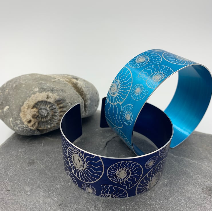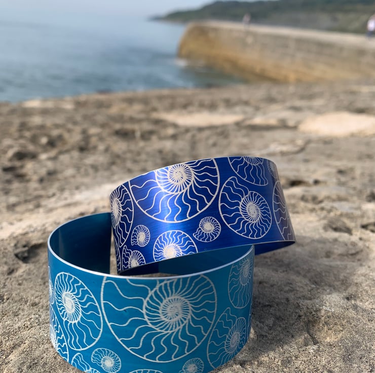 A beautiful turquoise statement cuff from my ‘Anning collection’ which was inspired by a visit to the ammonite pavement in Lyme Regis. The design was drawn by me digitally then laser etched onto hand painted anodised aluminium.