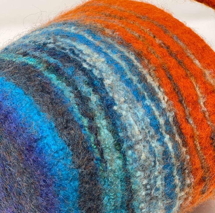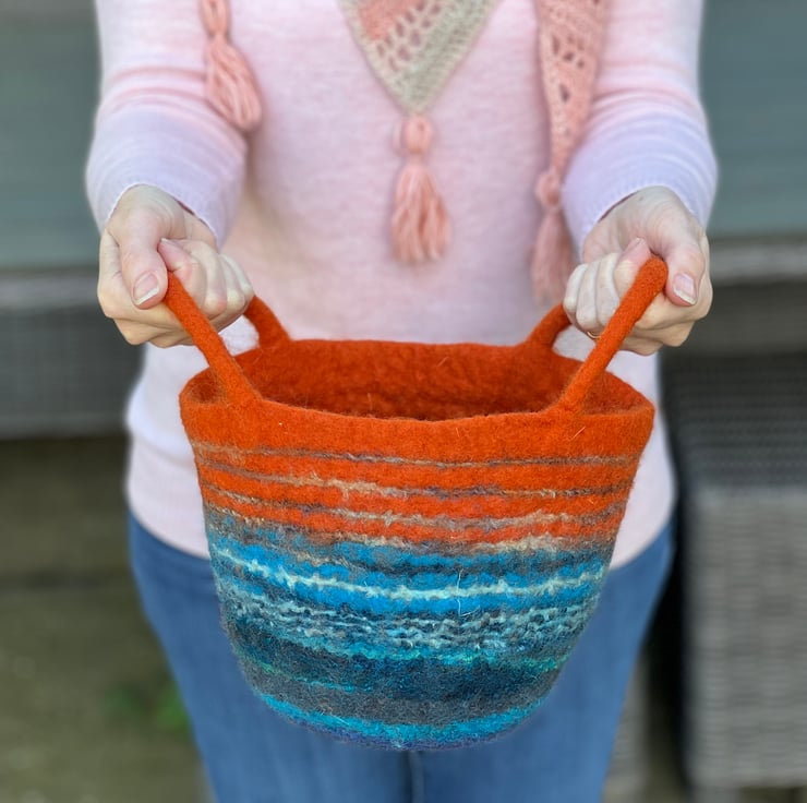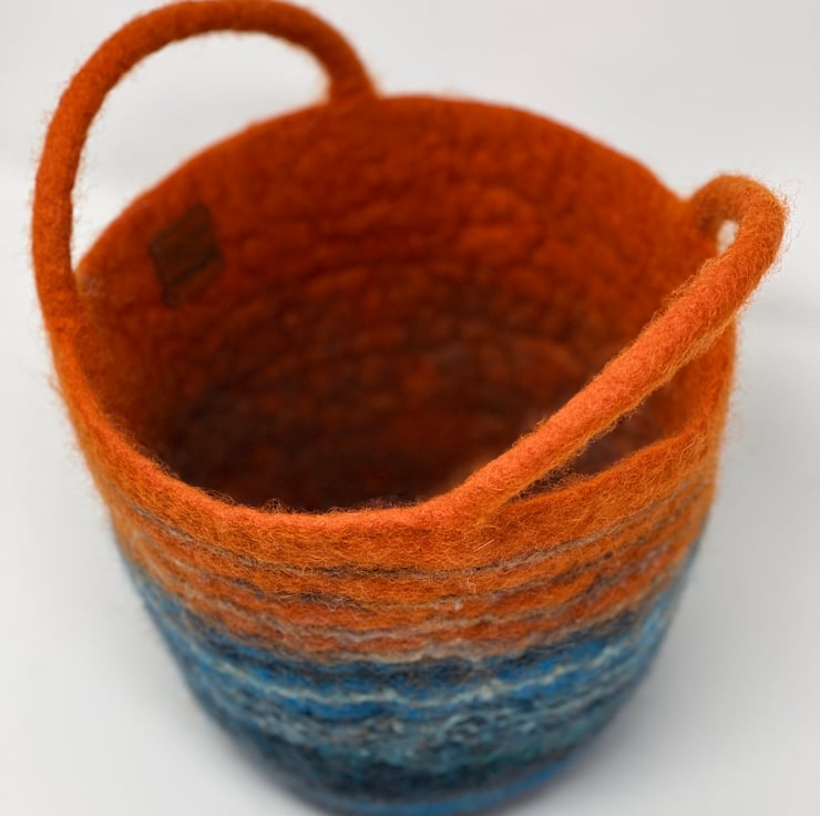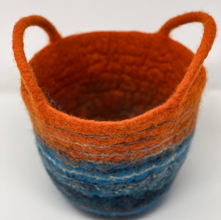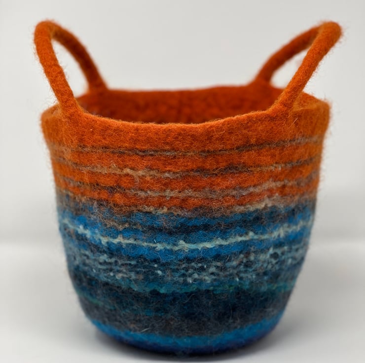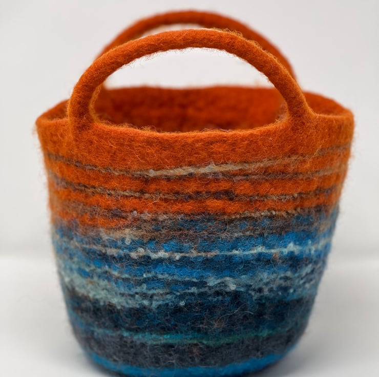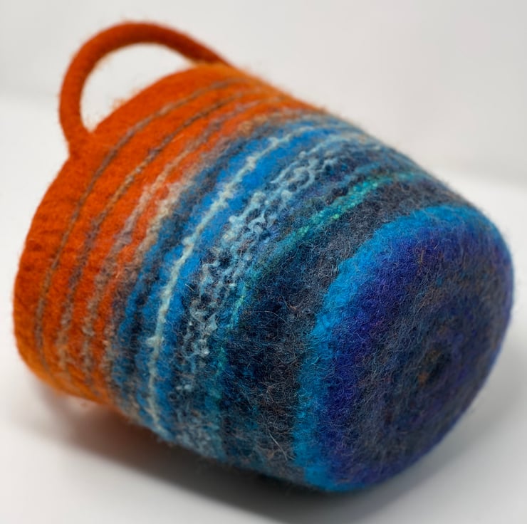 This medium-sized felt basket has been hand-felted by me using a felting ball. The felt has been made using blue and rust/orange-coloured wool fibre, with a detailed yarn design in various shades of blue and brown to create an overall seascape-style design/pattern.