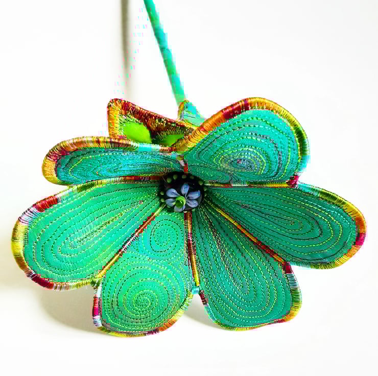 It has a flower with a glass bead in the middle, a green leaf coming out of the side and a wooden stem wrapped in green fabric.