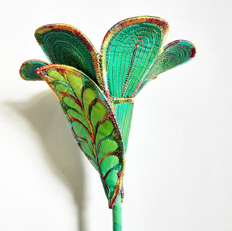 Made from layers of fabric including hand dyed Egyptian cotton and silk fabrics using the free machine embroidery style of sewing