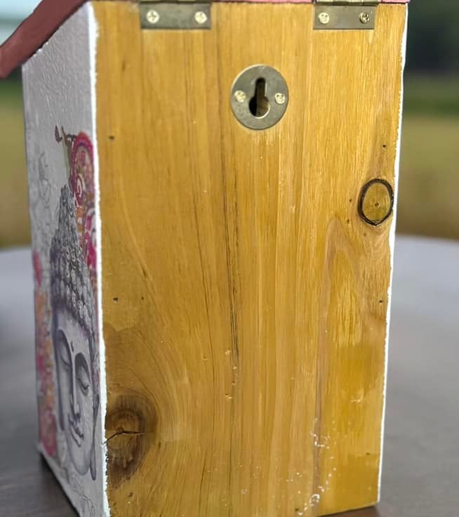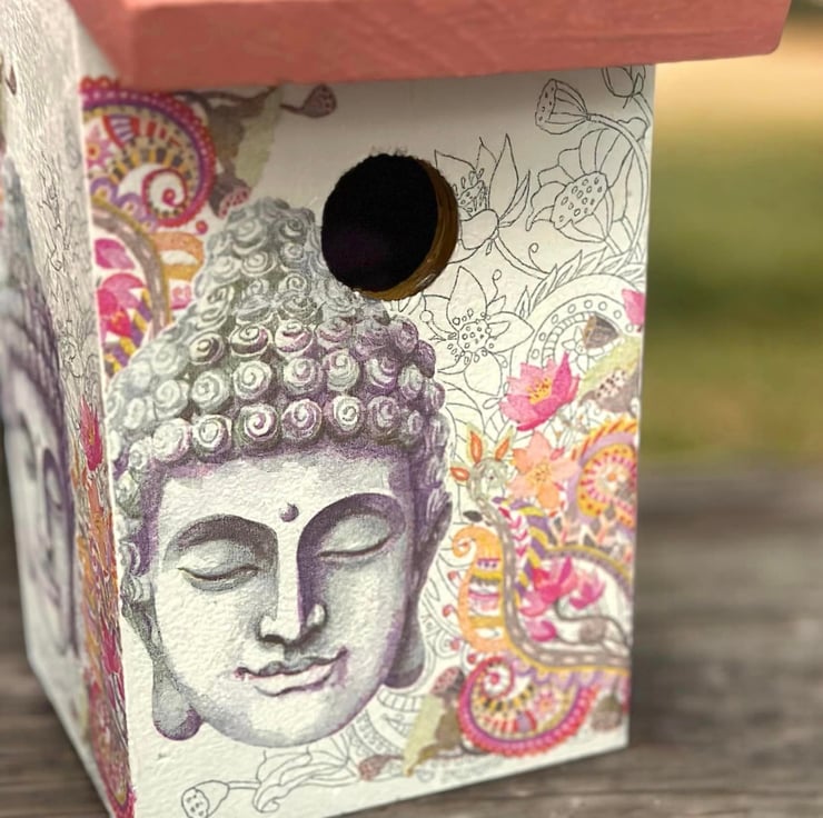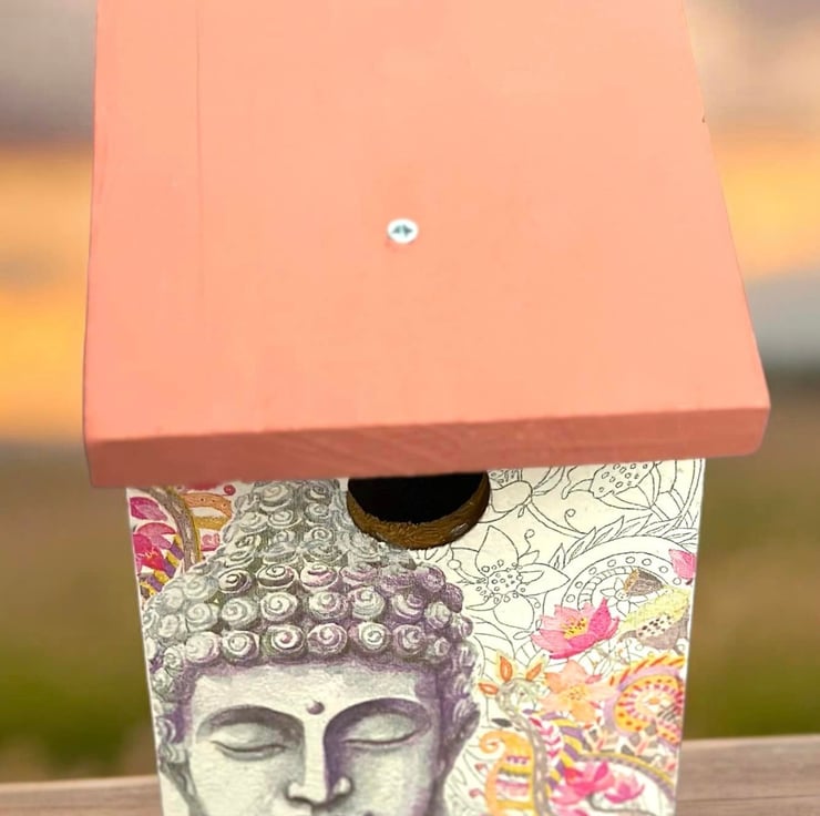A chic Buddha Birdhouse' looking for a perfect spot in a garden.This stunning birdhouse will certainly make a perfect gift to any garden lover or a treat for yourself.