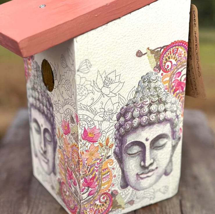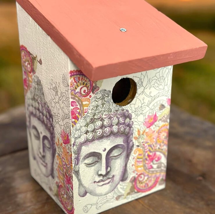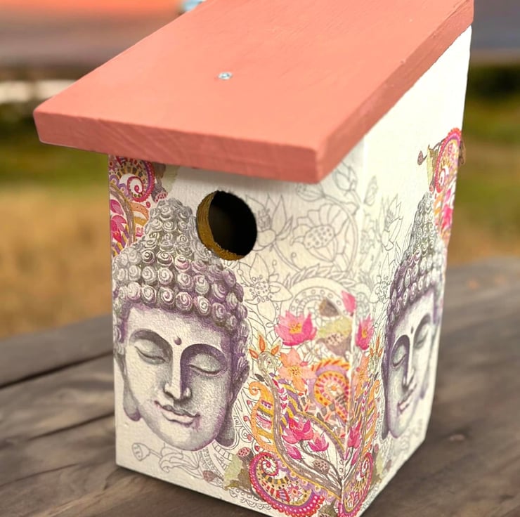 The image has been applied to an FSC sourced birdhouse after being painted with Annie Sloan chalk paint, using the art of Decoupage and finished a water resistant varnish.