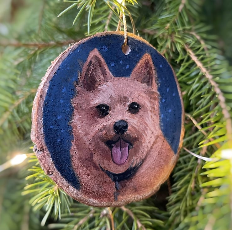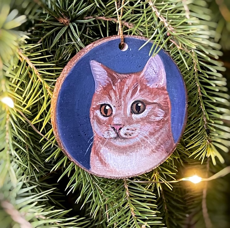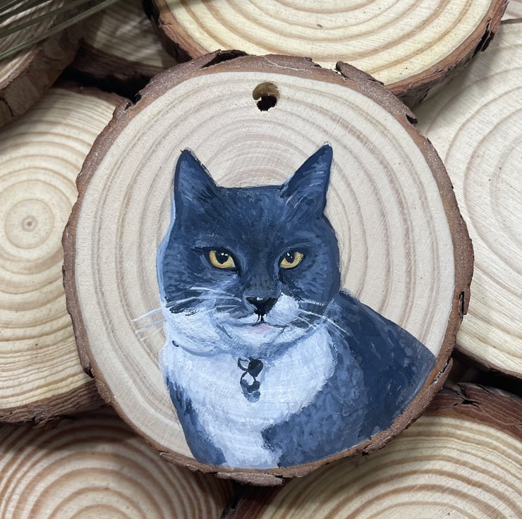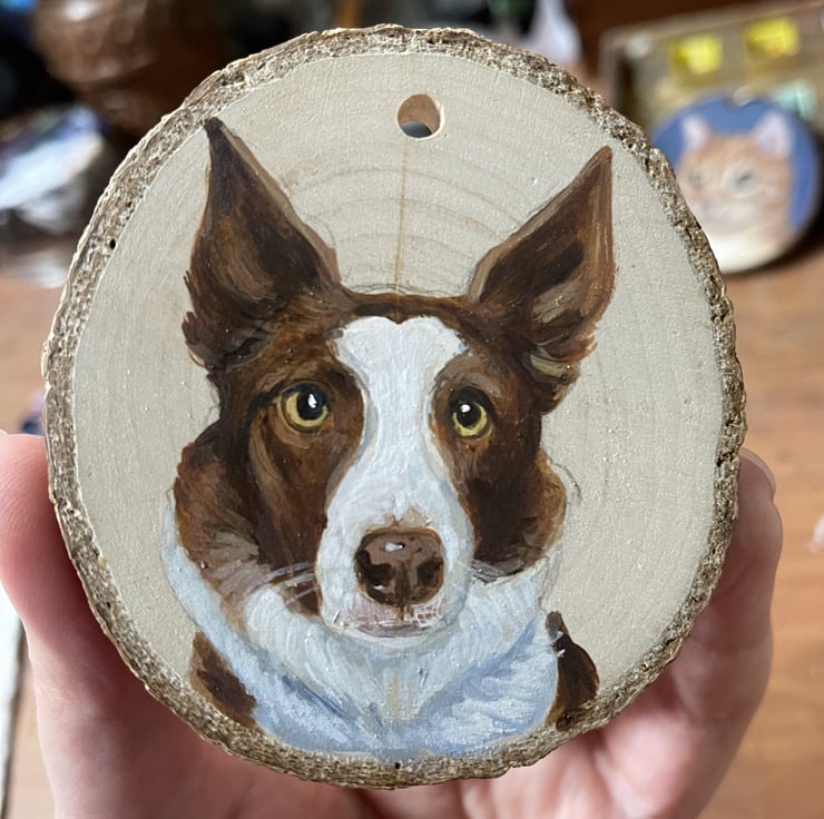 Hand painted pet portraits on a wooden slice, to be used as Christmas tree decorations (or wherever you'd like!).