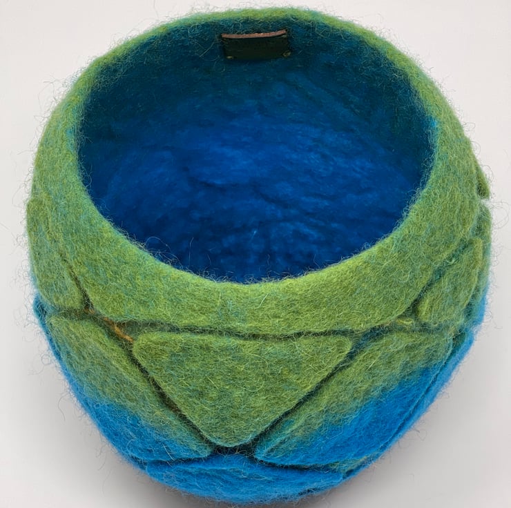 This small felt vessel has been hand-felted by me using a felting ball. The felt has been made using three colours of wool fibre (green, turquoise and navy blue). For the design I have used a cutaway technique to reveal mohair yarn lines in yellow, green and blue. Please note that some of the felt is quite thin in the cutaway areas so this vase is not suitable for heavy wear, it is best kept as a display art piece.