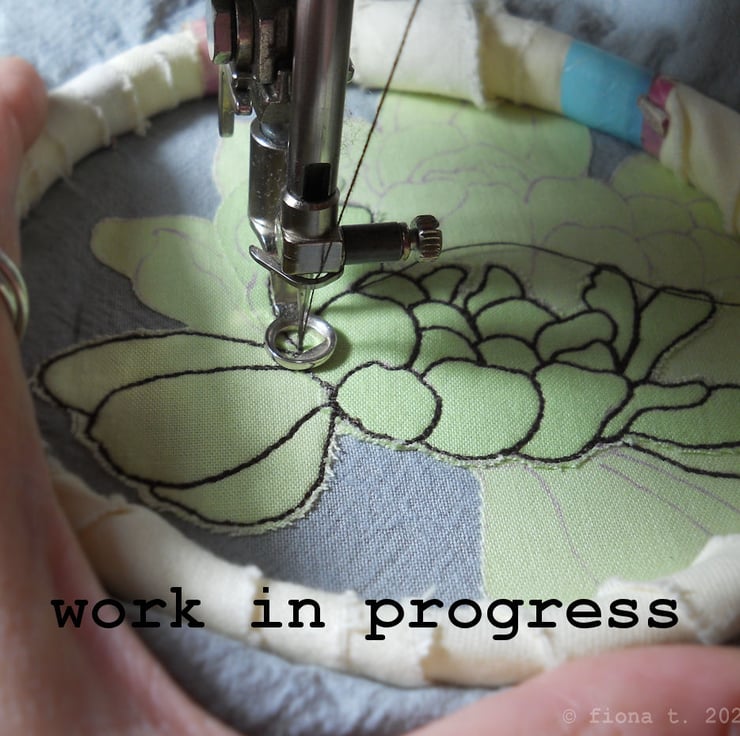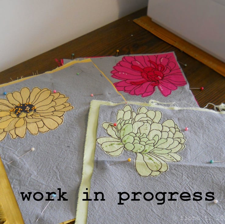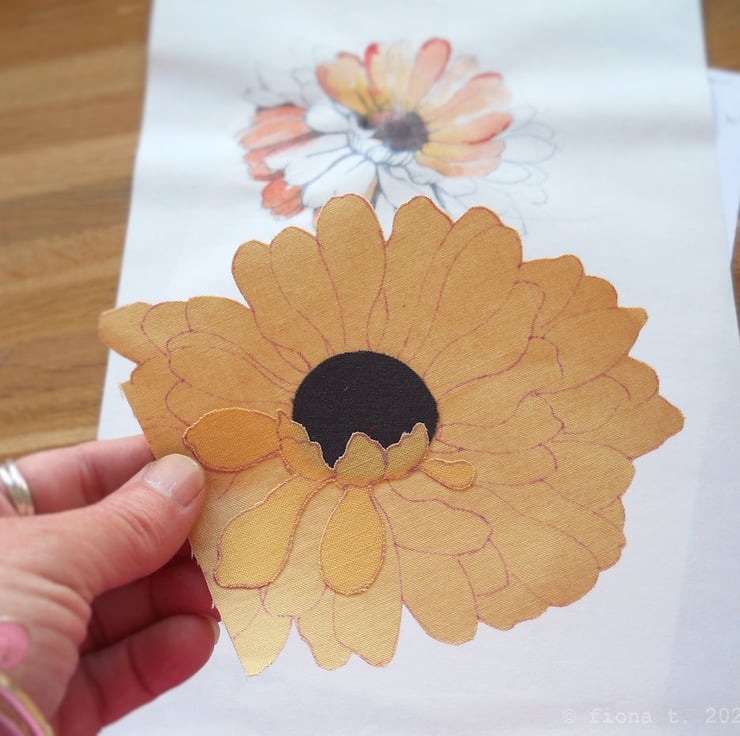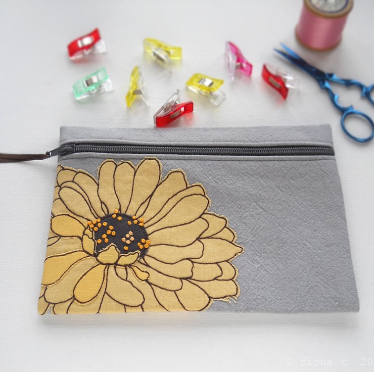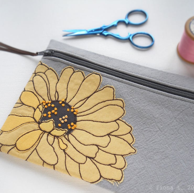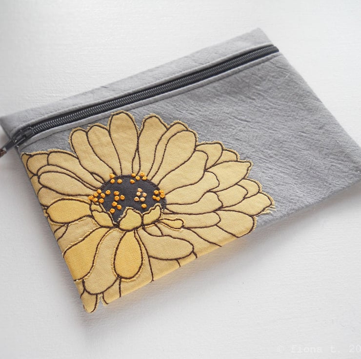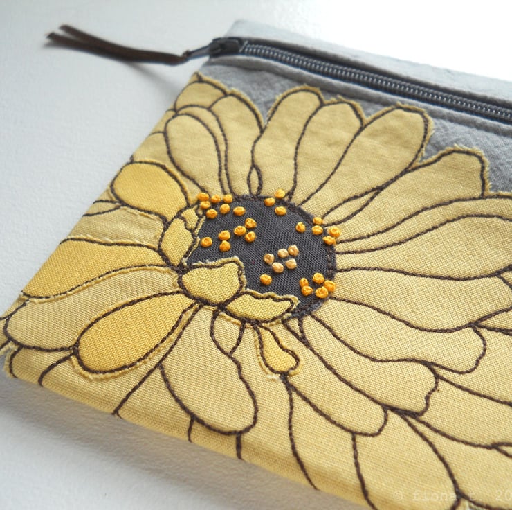 translated from my original pencil sketch, this flower is free hand embroidered in soft buttery yellows on to hand dyed grey cotton calico.
