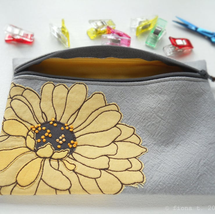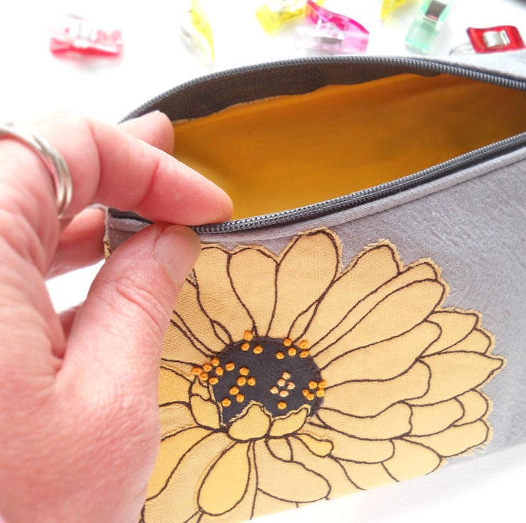 it’s stiffened with interfacing, lined with coordinating sunny yellow cotton, and has a grey zip fastening.