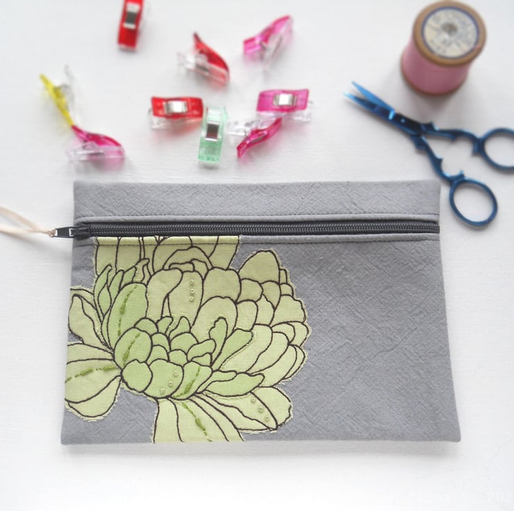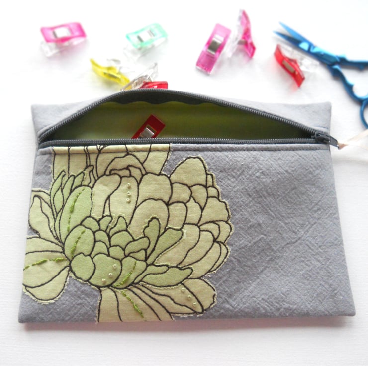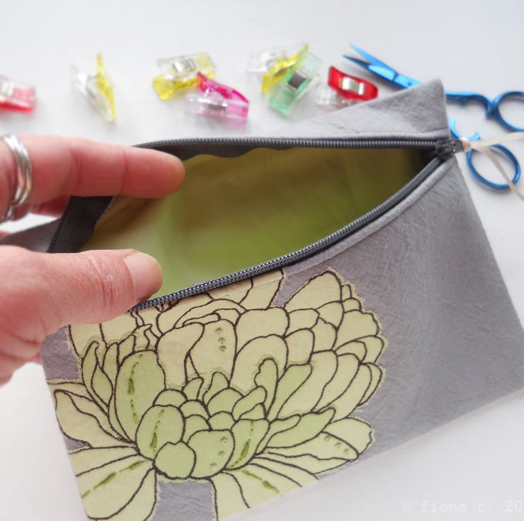 it’s stiffened with interfacing, lined with coordinating apple green cotton, and has a grey zip fastening.
