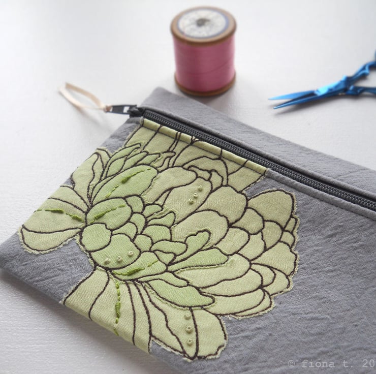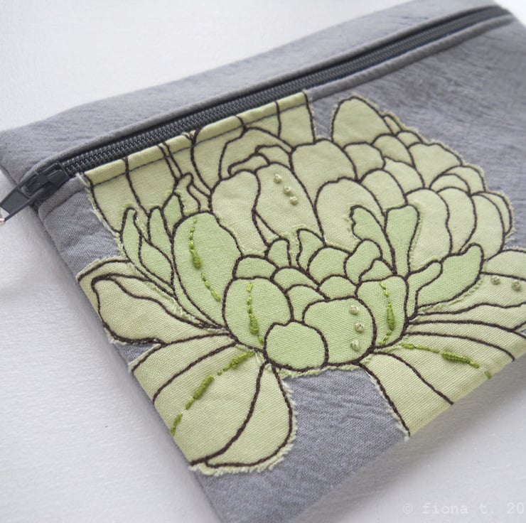 translated from my original pencil sketch, this flower is free hand embroidered in pale yellowy greens on to hand dyed grey cotton calico.