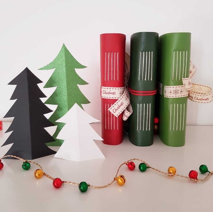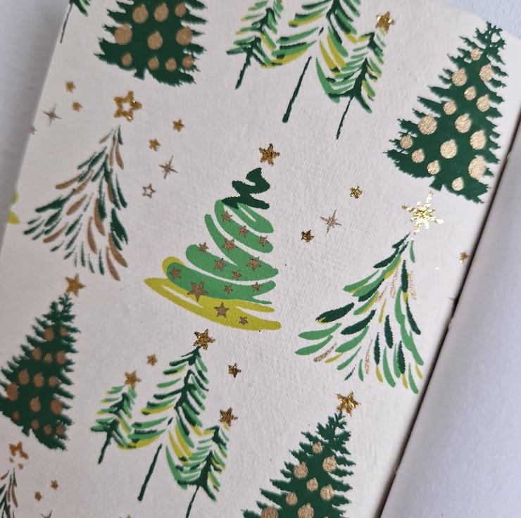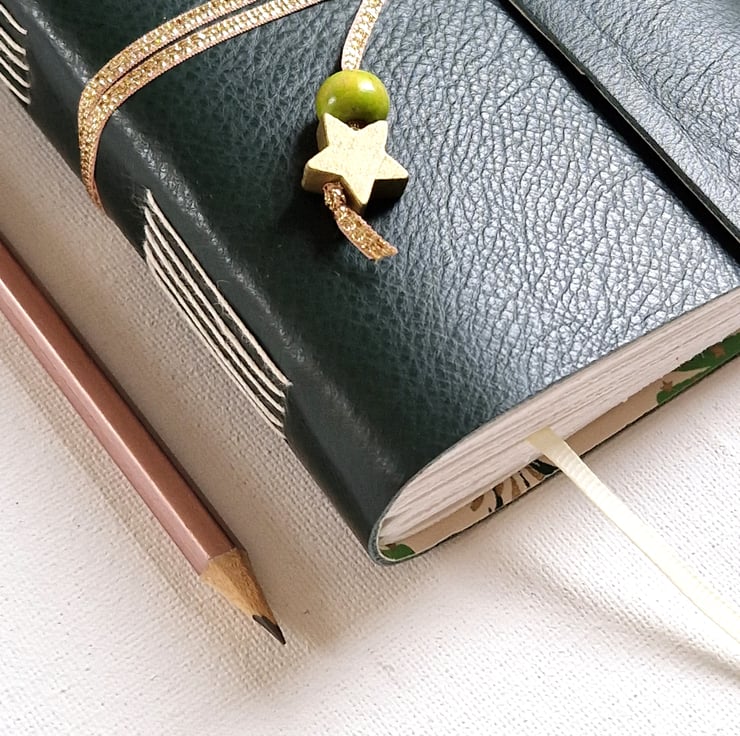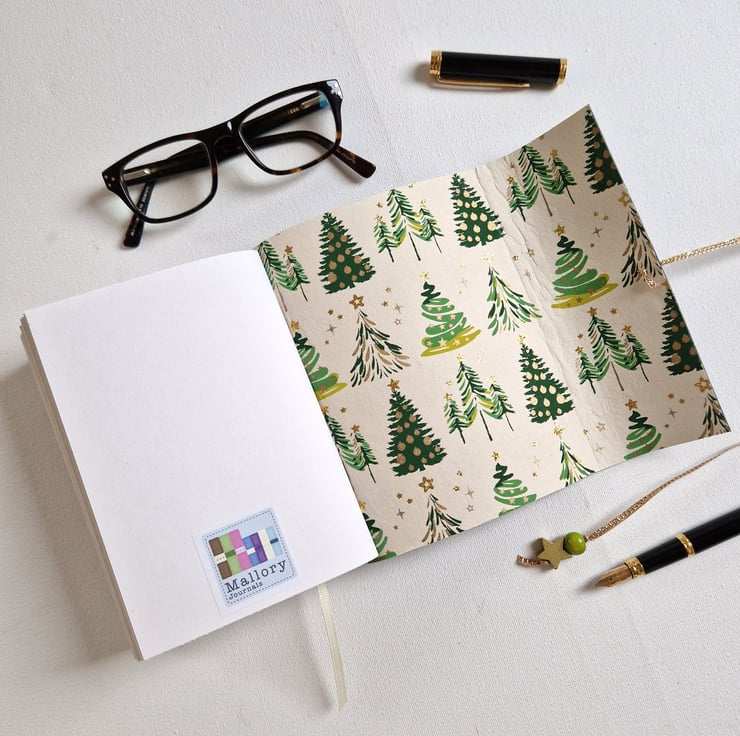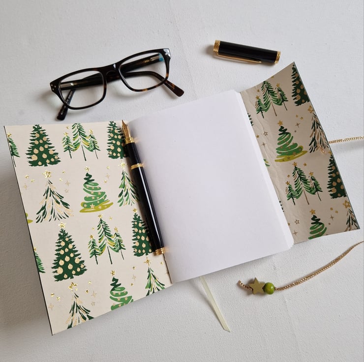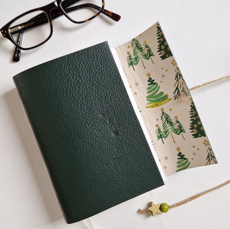 Beautiful Dark Green Leather Christmas Journal Hand Bound and lined with a luxury Christmas Tree Paper, embellished with gold. The Journal is closed with a Gold Ribbon finished with two wooden Beads. Great for Christmas Lists, Plans or Recipes. Or place under the tree for the whole family to record those fabulous Memories as they happen, making a beautiful Family Tradition and Keepsake.