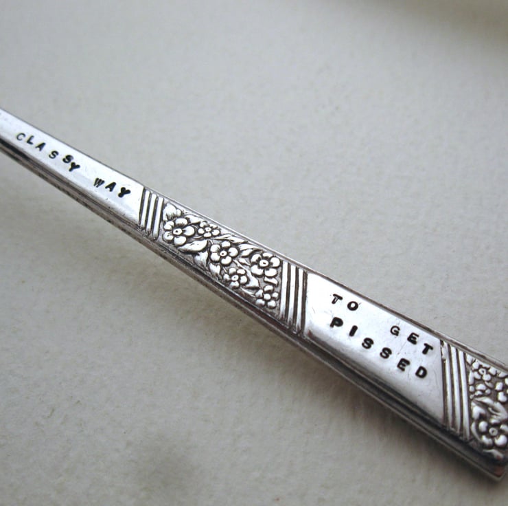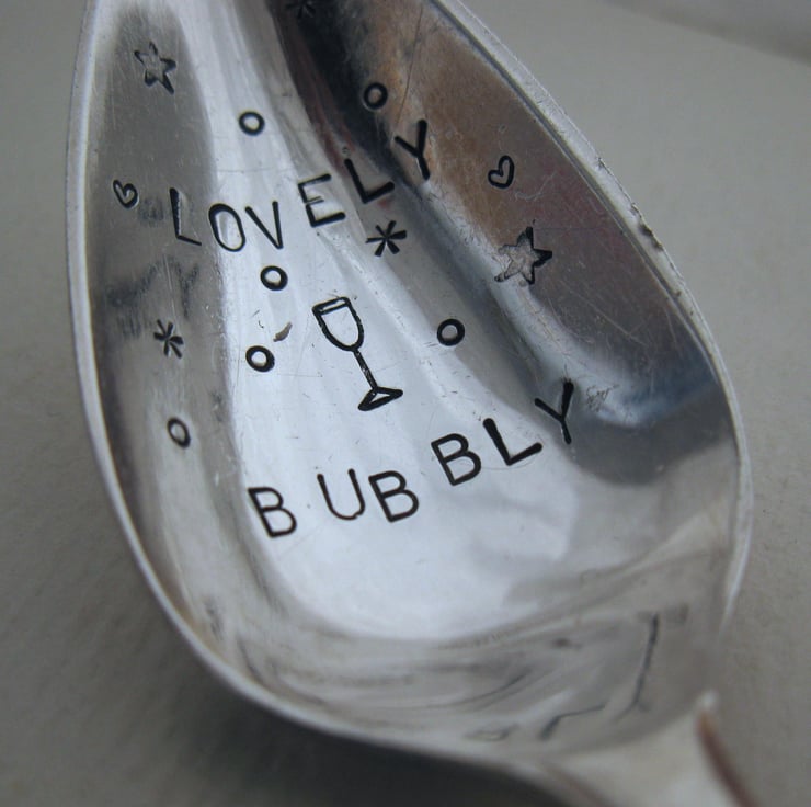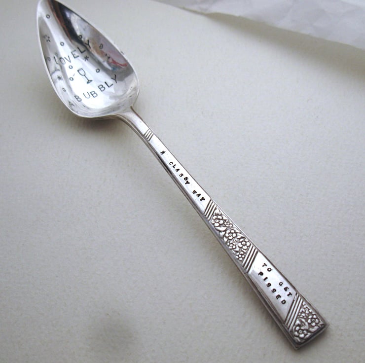 A handstamped vintage silver plated spoon to put in the neck of your sparkling wine bottle - apparently this keeps the bubbles bubbly for longer although I've never had leftovers for long enough to do a proper test! I've hand stamped 'LOVELY BUBBLY' in the bowl, along with a little glass icon and some hearts, stars and bubbles, and added 'A CLASSY WAY TO GET P-SSED' in smaller lettering on the handle.