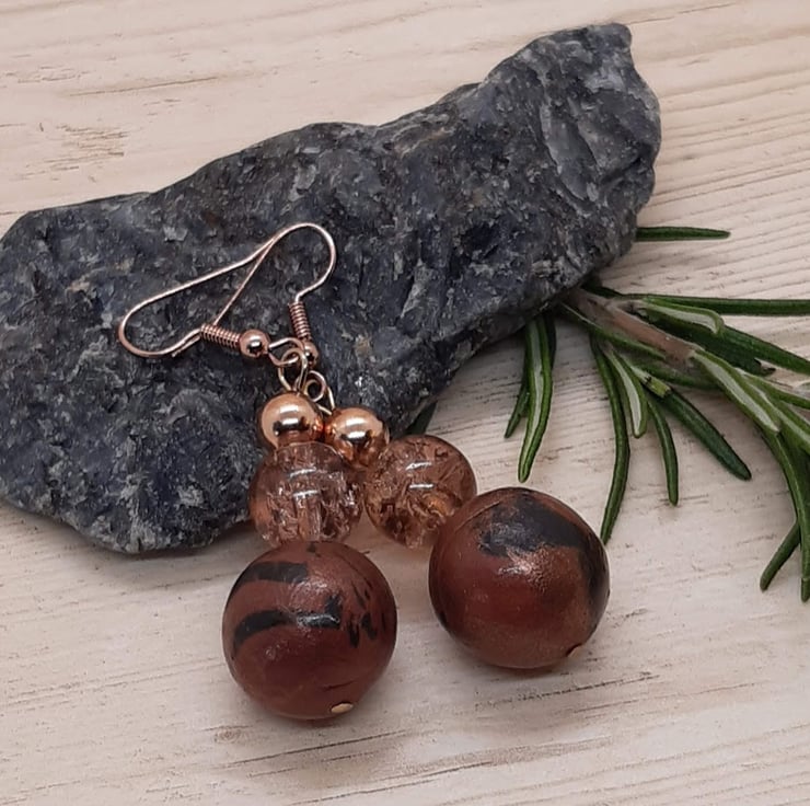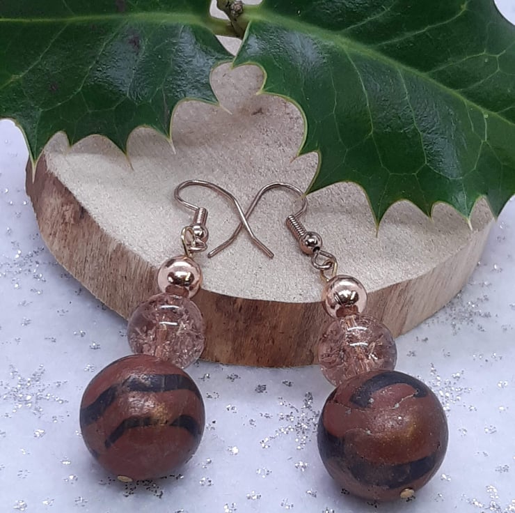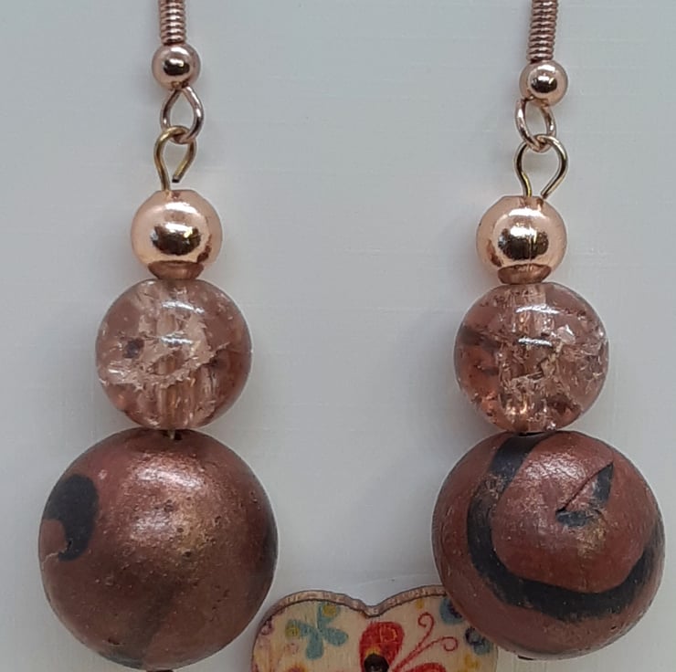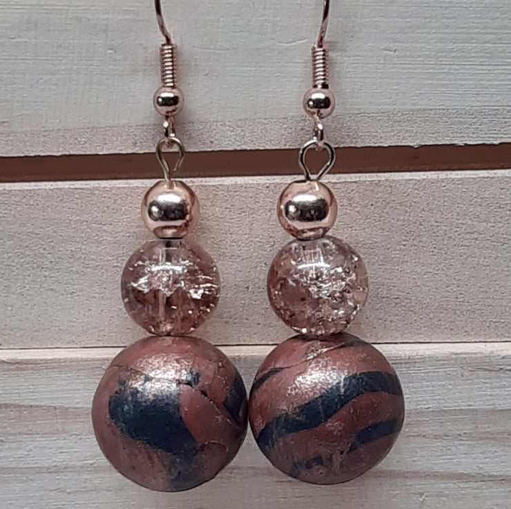 The polymer clay bead measures 16.2mm with a 10mm pinky brown crackle bead and 6mm rose gold shiny round to finish.