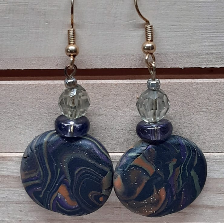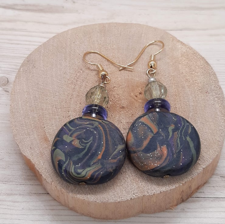 Polymer clay disc earrings in a black, orange and sage swirl design with a hint of sparkle.