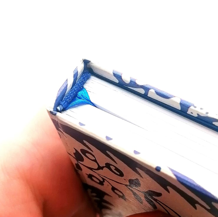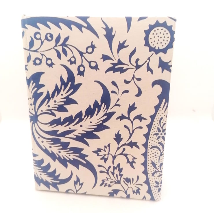 Featuring plain paper internally, which is hand sewn, cased with a chipboard cover that is covered in a premium paper featuring a navy blue floral pattern. The premium paper is slightly textured giving a luxurious quality.