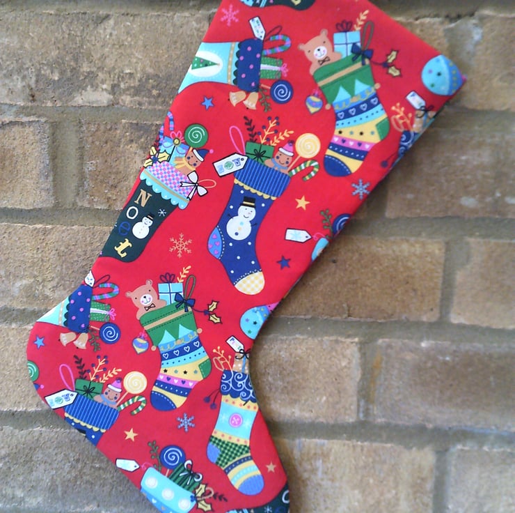 This Christmas Stocking is made using red fabric with a design of stockings full of gifts and is fully lined.