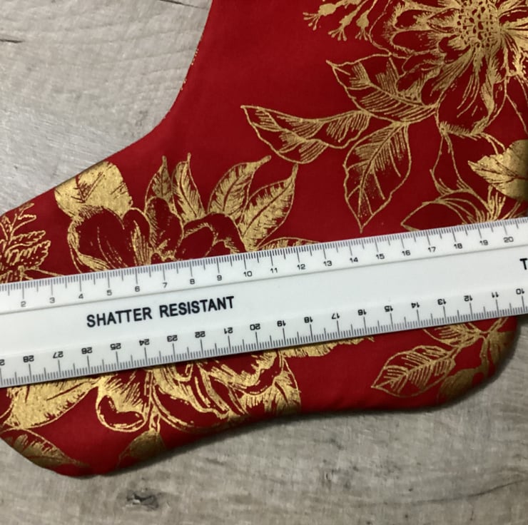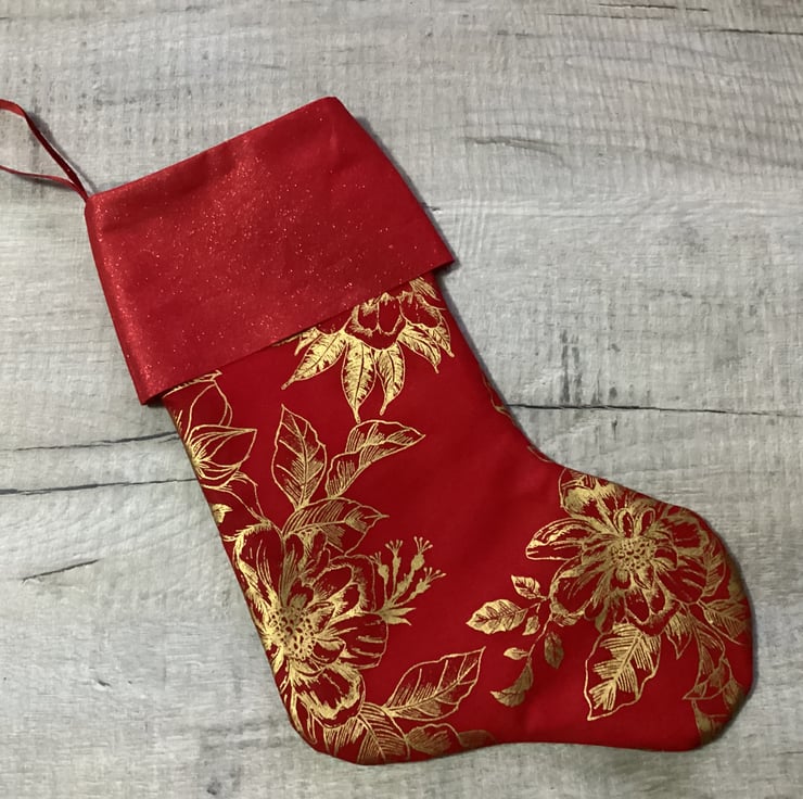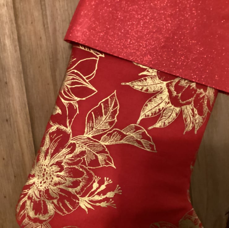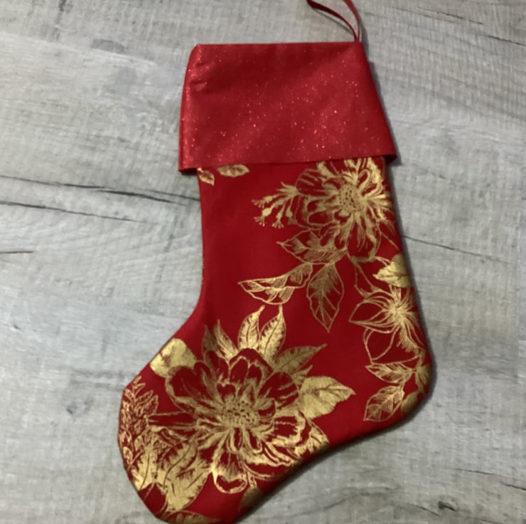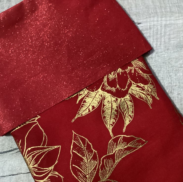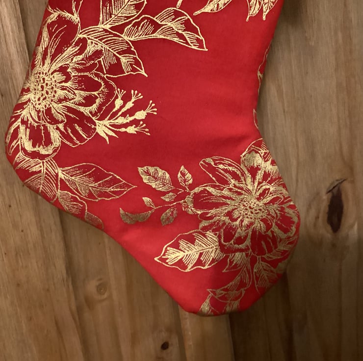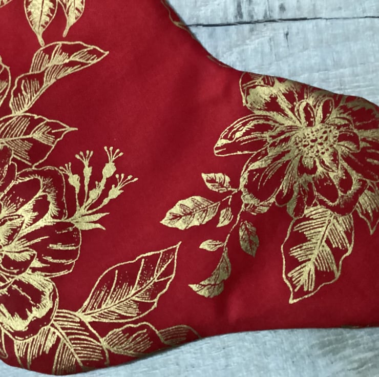 I’ve used beautiful R. Kaufman 100% Christmas Floral metallic cotton fabric in red and gold. colours. Stocking is fully lined in white canvas cotton fabric.