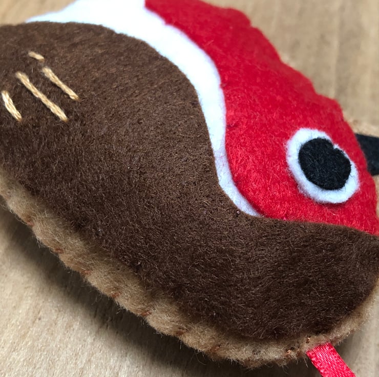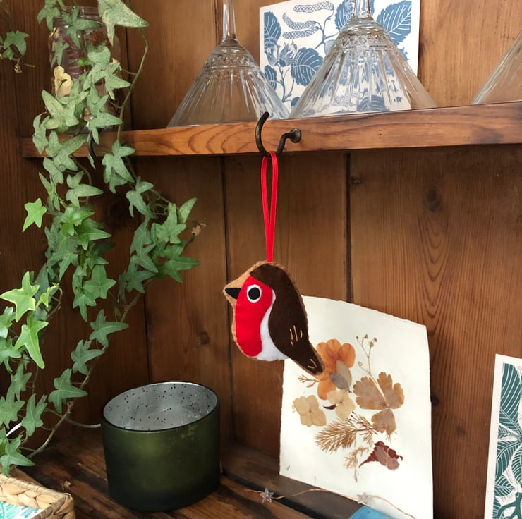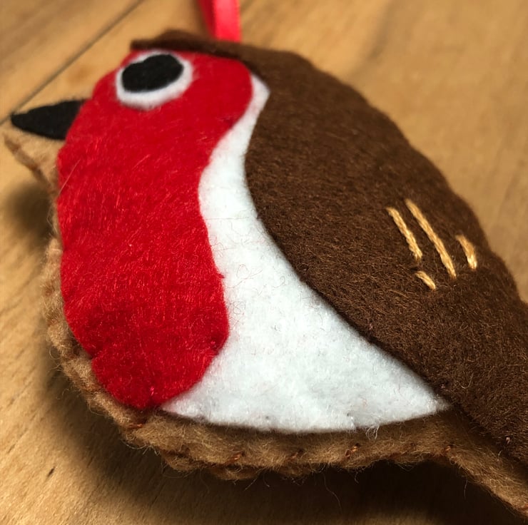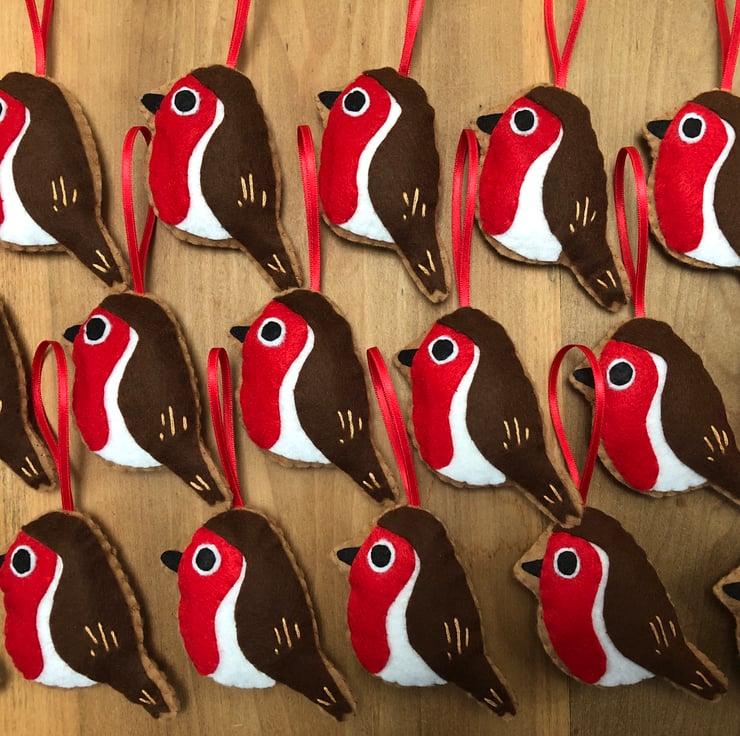 These handmade felt robins are the perfect decorations for Christmas trees and furniture. They would also make great gifts. Each is handmade with felt, thread and ribbon, plus a little stuffing.