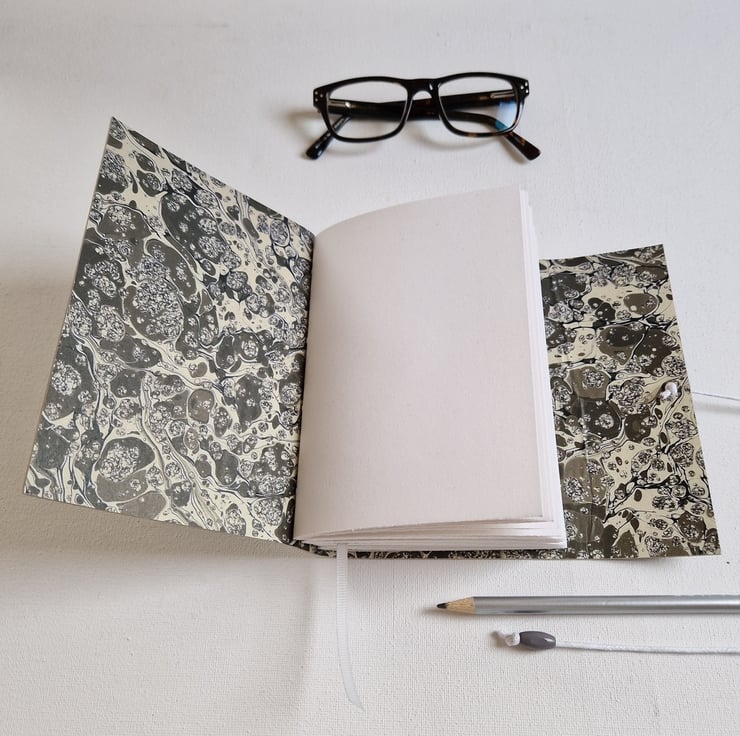 Beautiful Soft Silver Grey Leather Journal Hand Bound with monochrome marbled paper lining the covers. Perfect gift for an Artist, Journaler, Note taker or Writer.